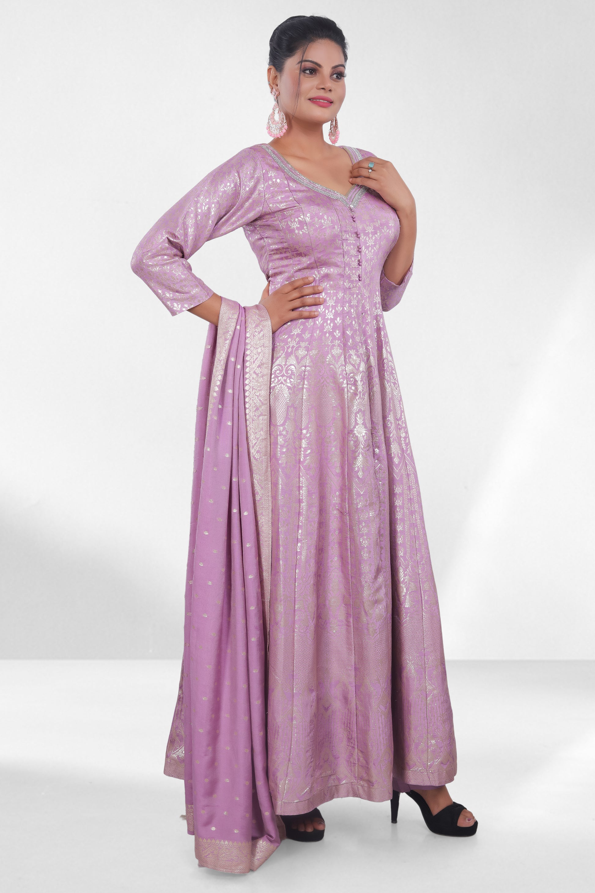 Embrace ethereal charm in this lilac brocade suit set, featuring delicate sequin work that shimmer with every move. The flattering Anarkali silhouette, finished with a soft scalloped neckline and quarter sleeves, is paired with a matching dupatta for a graceful look. Perfect for receptions, roka ceremonies, or any event where elegance takes center stage.