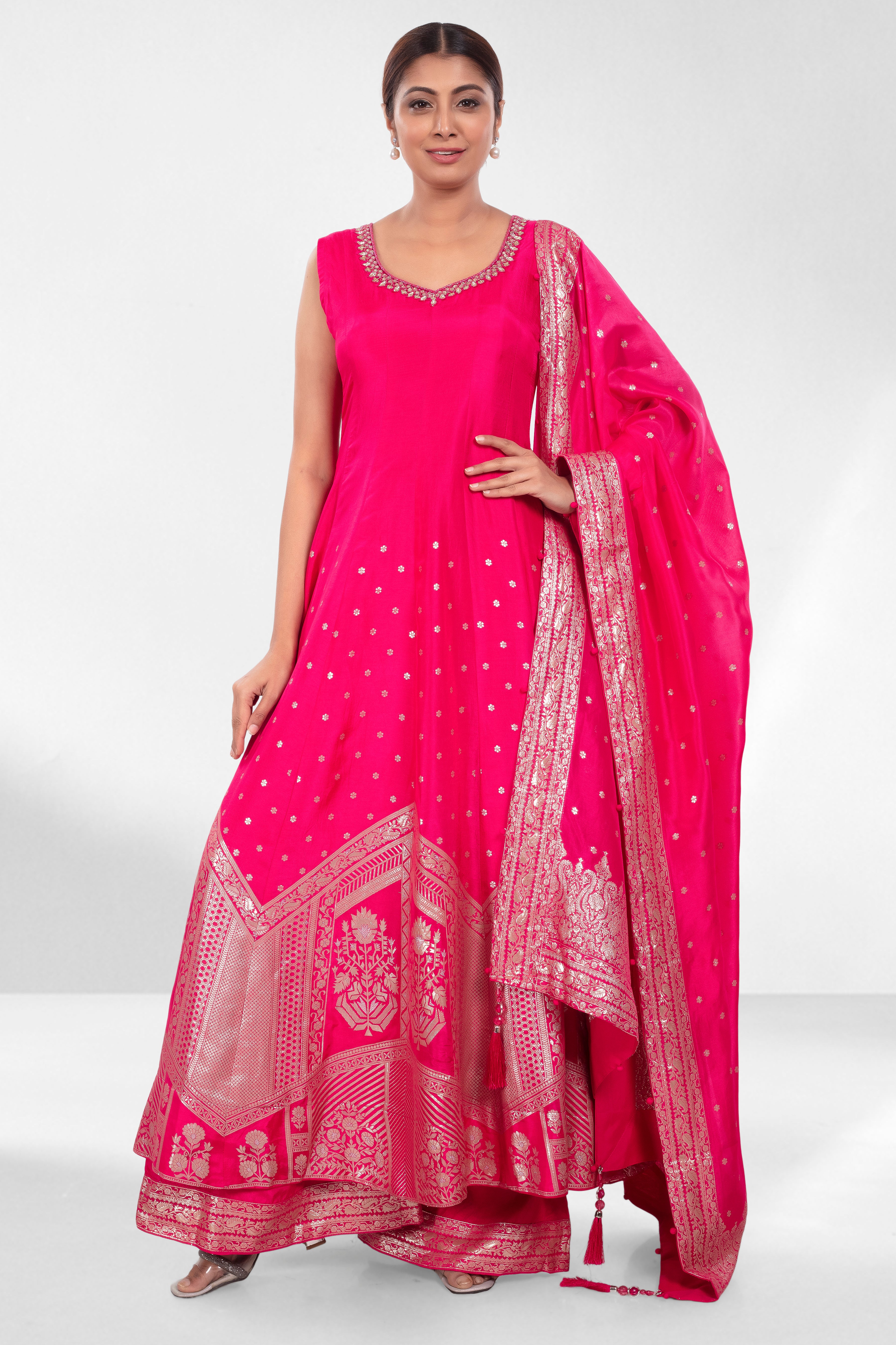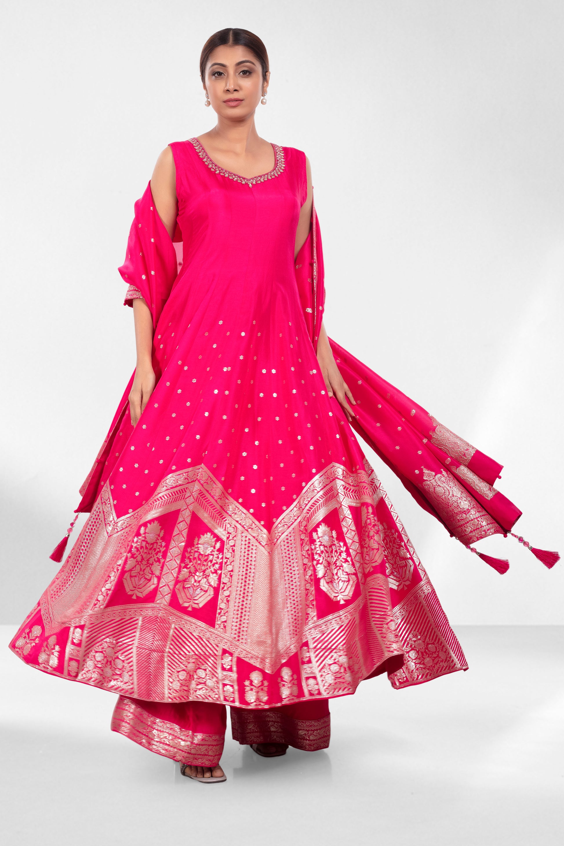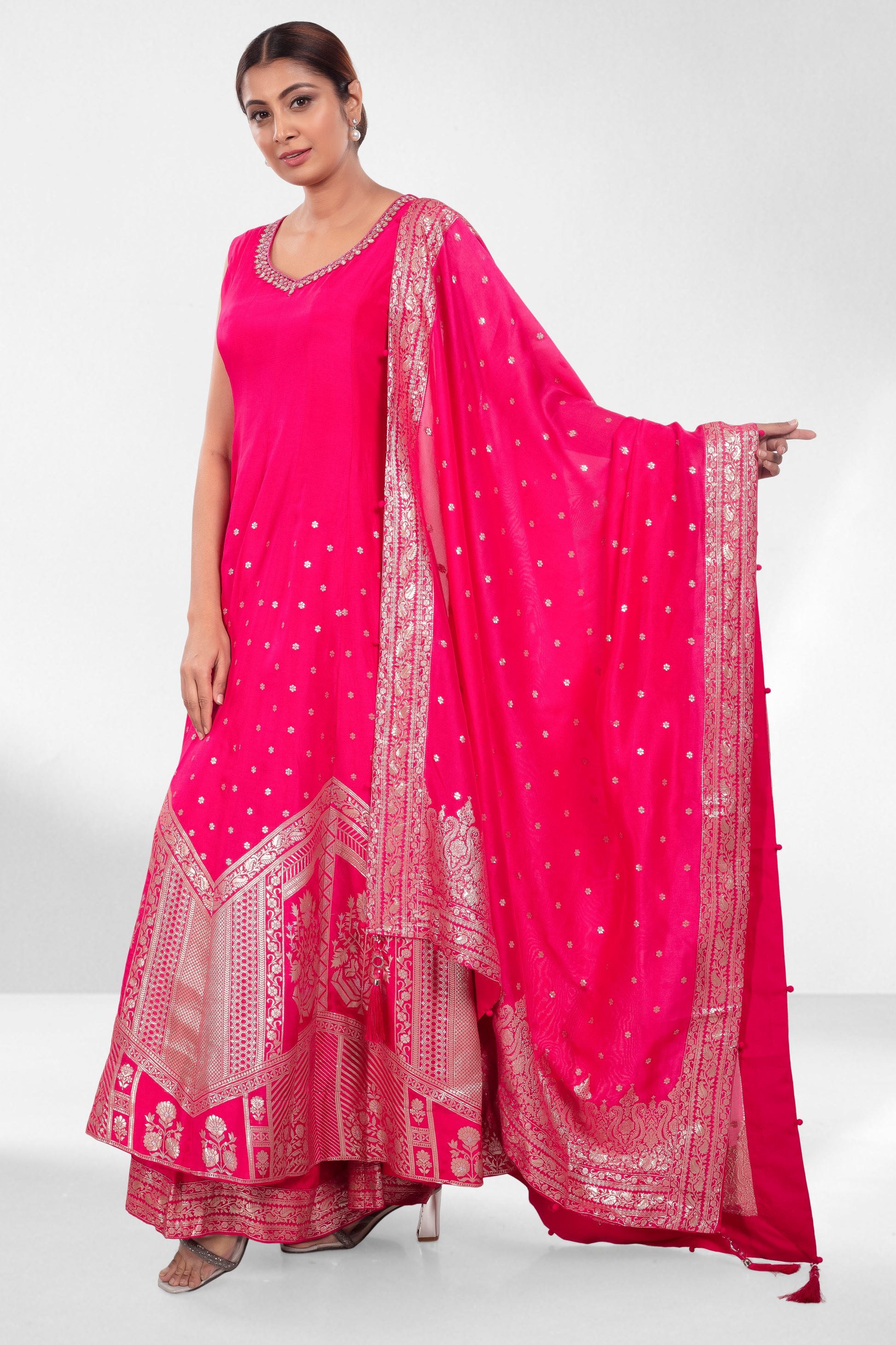 Grace meets grandeur in this vibrant rani pink ensemble, crafted for effortless elegance. The kurta features a flattering neckline accented with embroidery, while the flared silhouette cascades into intricate zari weaving along the hem. Paired with wide-legged pants and a regal dupatta showcasing traditional woven motifs and a detailed border, this outfit is perfect for wedding guests, festive soirees, or intimate ceremonies where style speaks volumes.