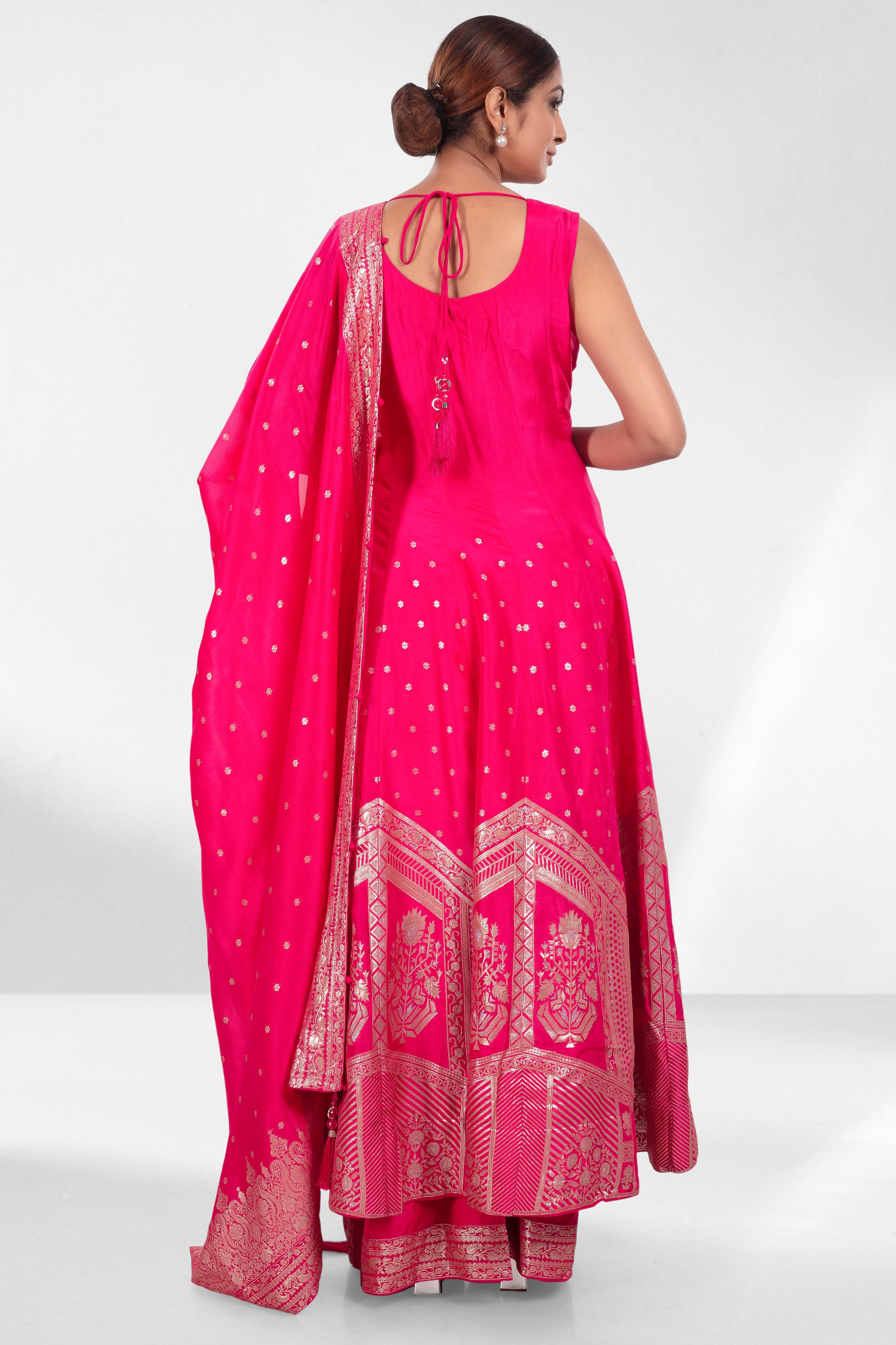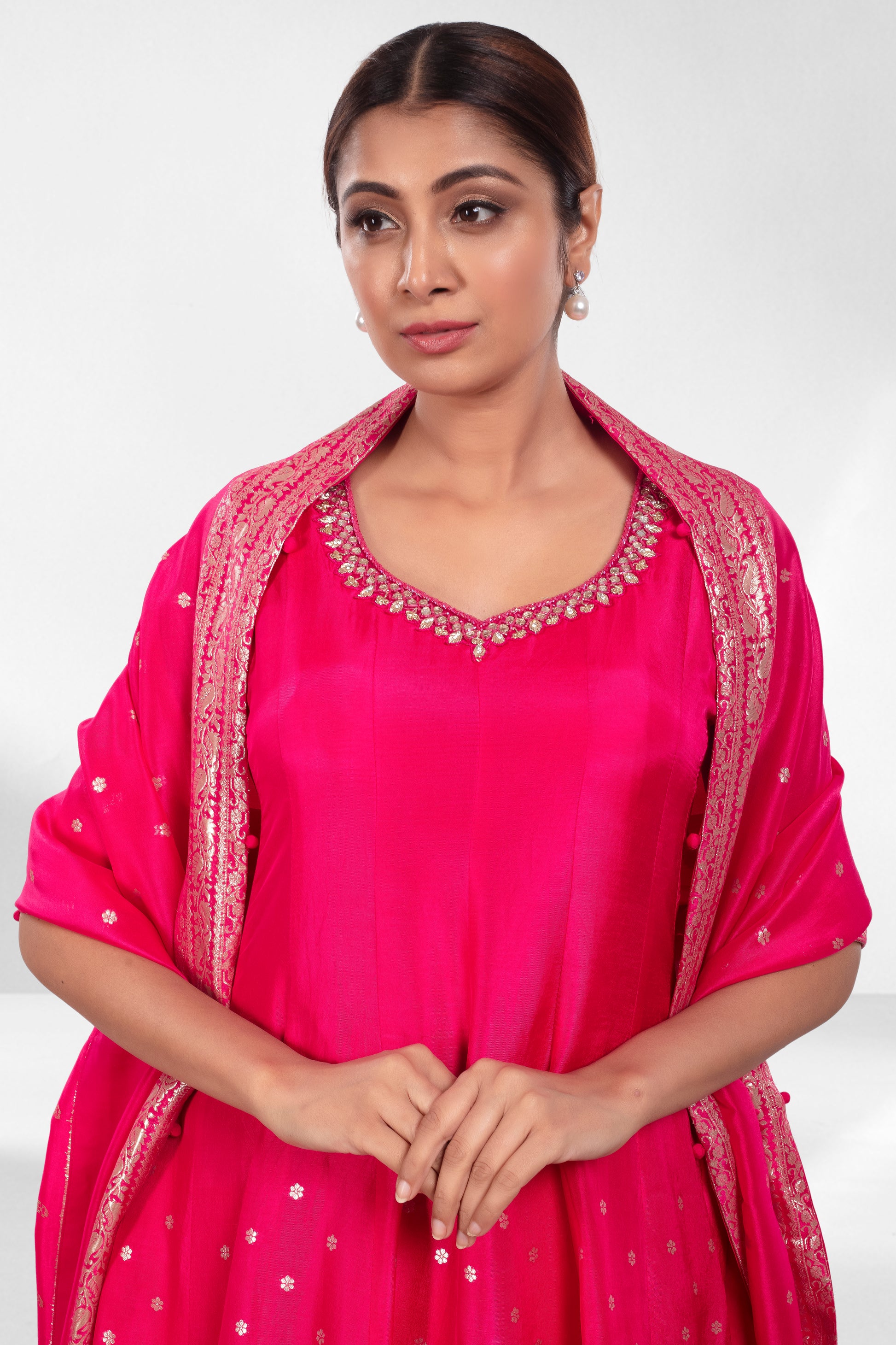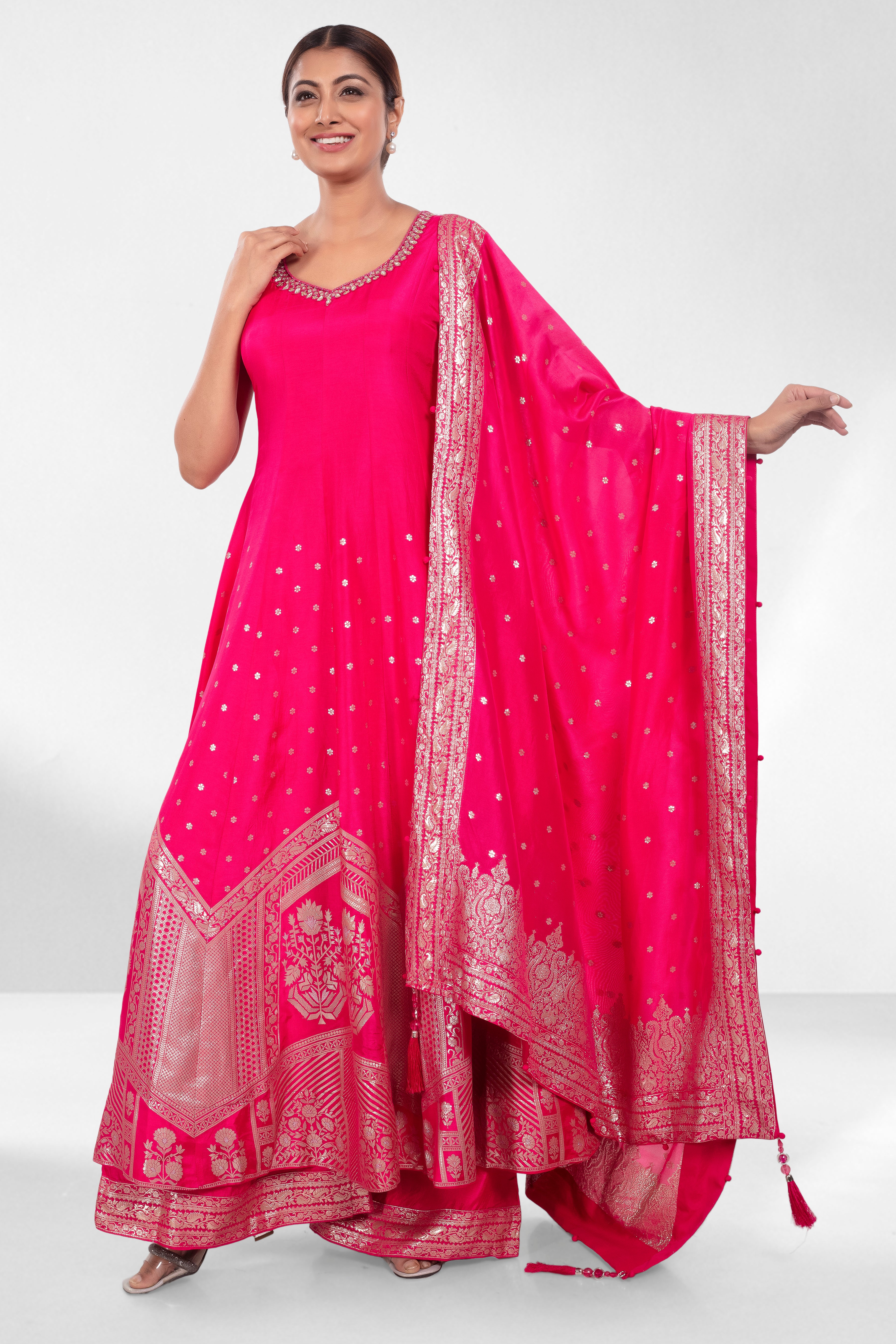 Grace meets grandeur in this vibrant rani pink ensemble, crafted for effortless elegance. The kurta features a flattering neckline accented with embroidery, while the flared silhouette cascades into intricate zari weaving along the hem. Paired with wide-legged pants and a regal dupatta showcasing traditional woven motifs and a detailed border, this outfit is perfect for wedding guests, festive soirees, or intimate ceremonies where style speaks volumes.