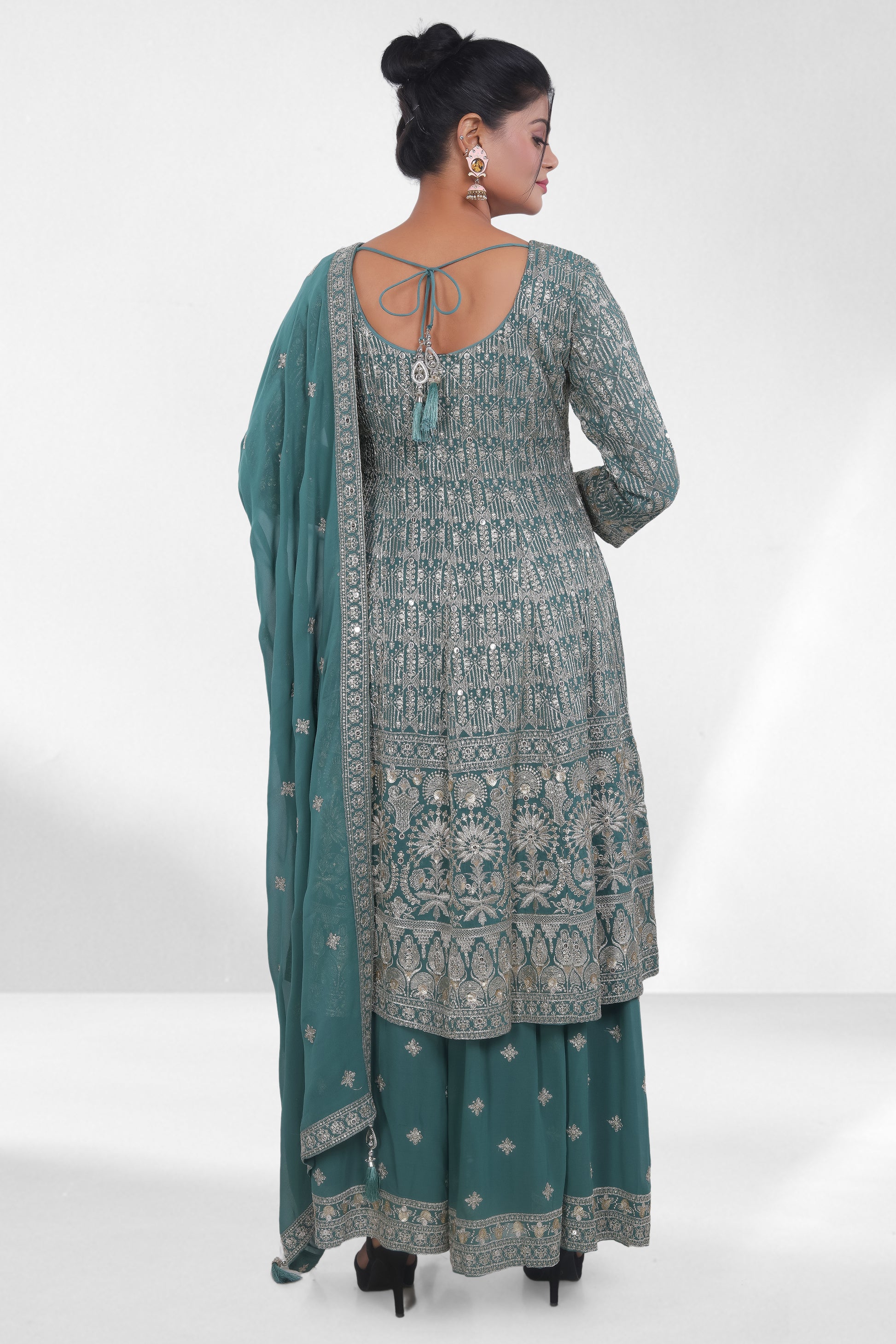 Elegance meets ease in this soothing teal palazzo set, featuring delicate sequin work and intricate thread embroidery. The long kurta is designed with full sleeves and a graceful flare, beautifully paired with wide-leg bottoms and a lightweight dupatta. Ideal for festive occasions or intimate weddings, this look radiates grace with every step.