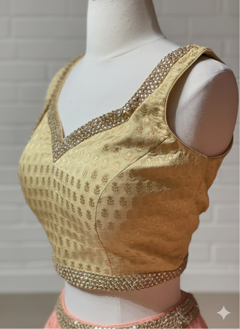Peach plain lehenga paired with brocade silk kundan embroidery blouse and net butti dupatta.