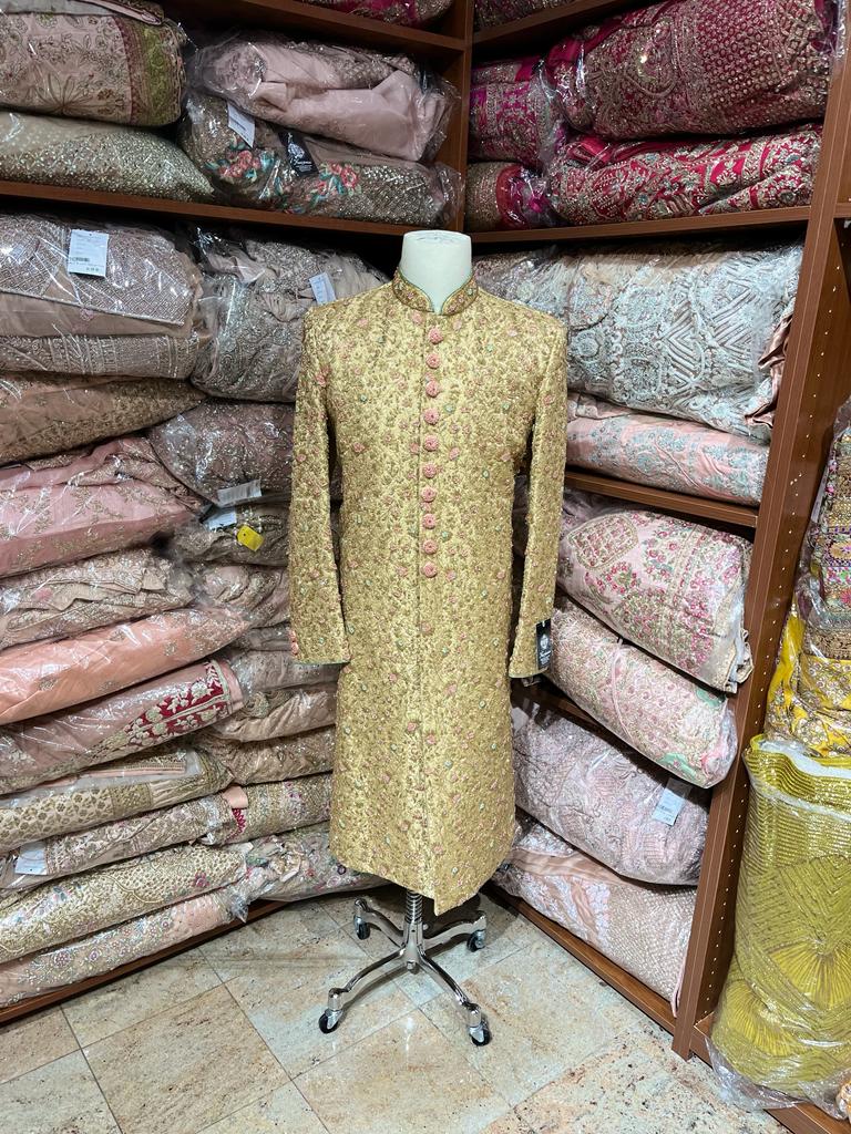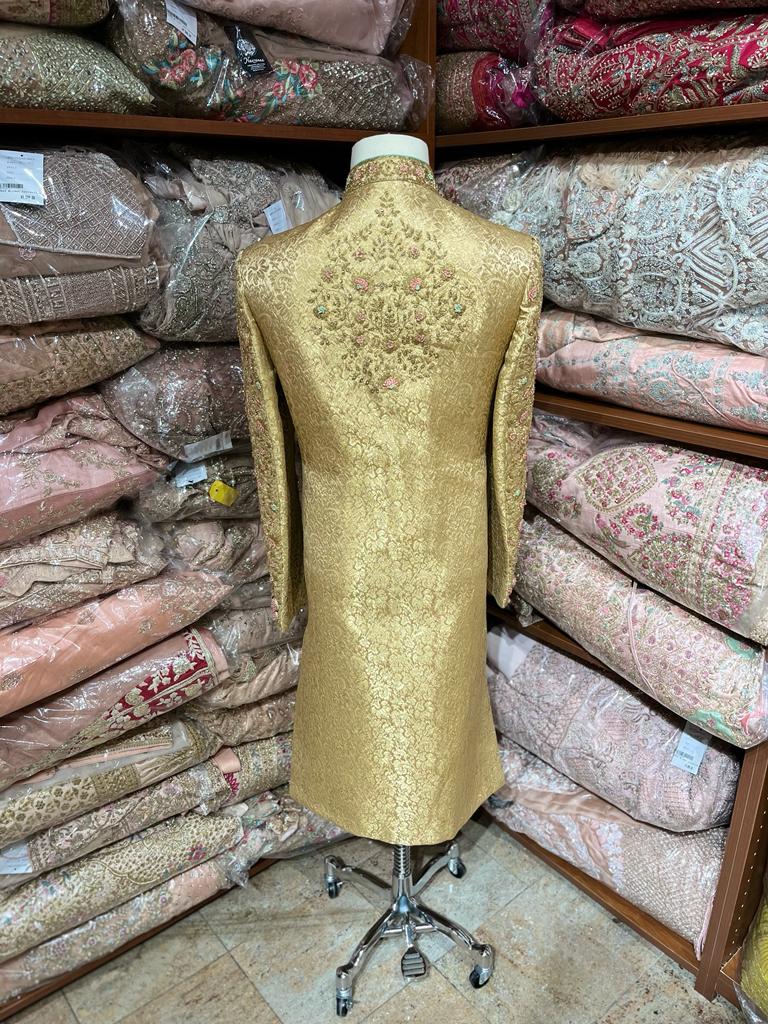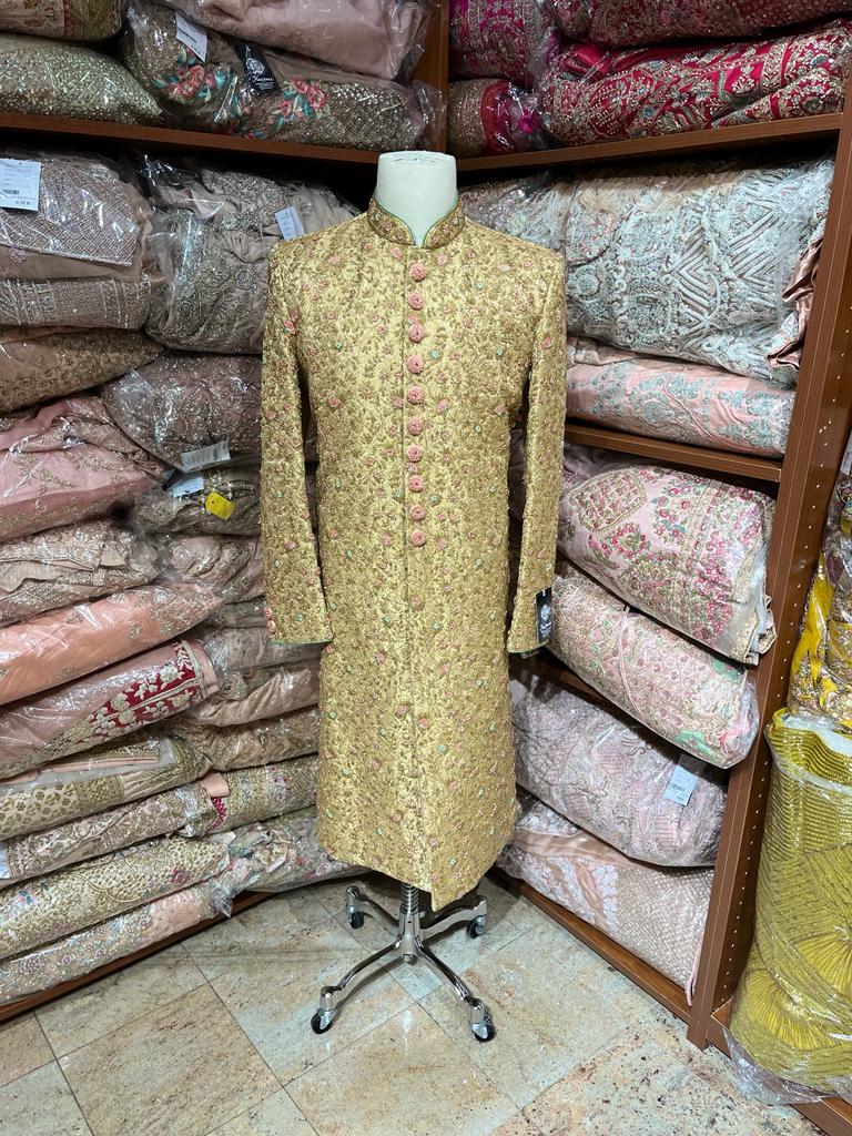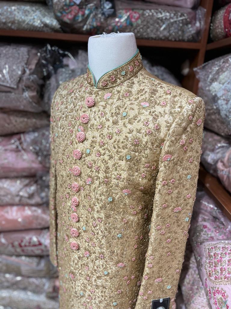 Gold floral brocade sherwani with blush & mint resham embroidery. Highlighted with cutdana and blush stones! Paired with a gold chudidar.
