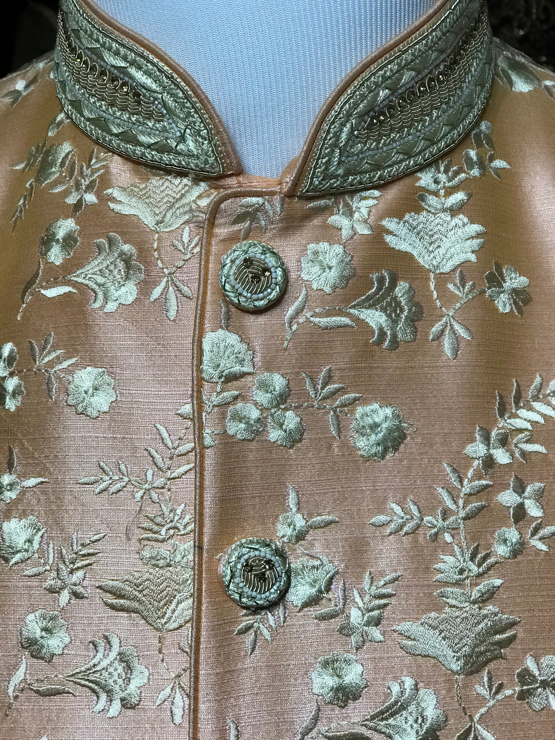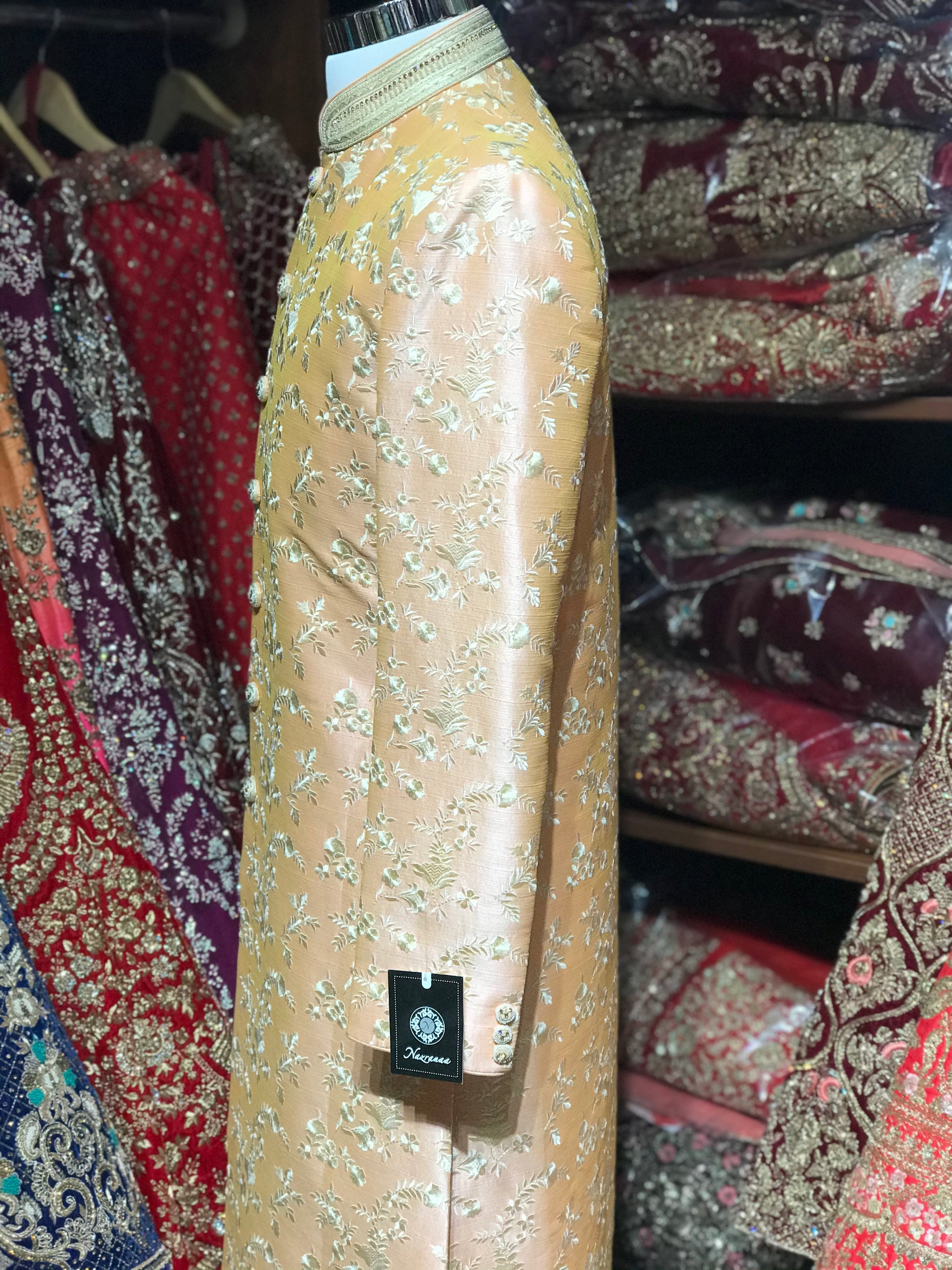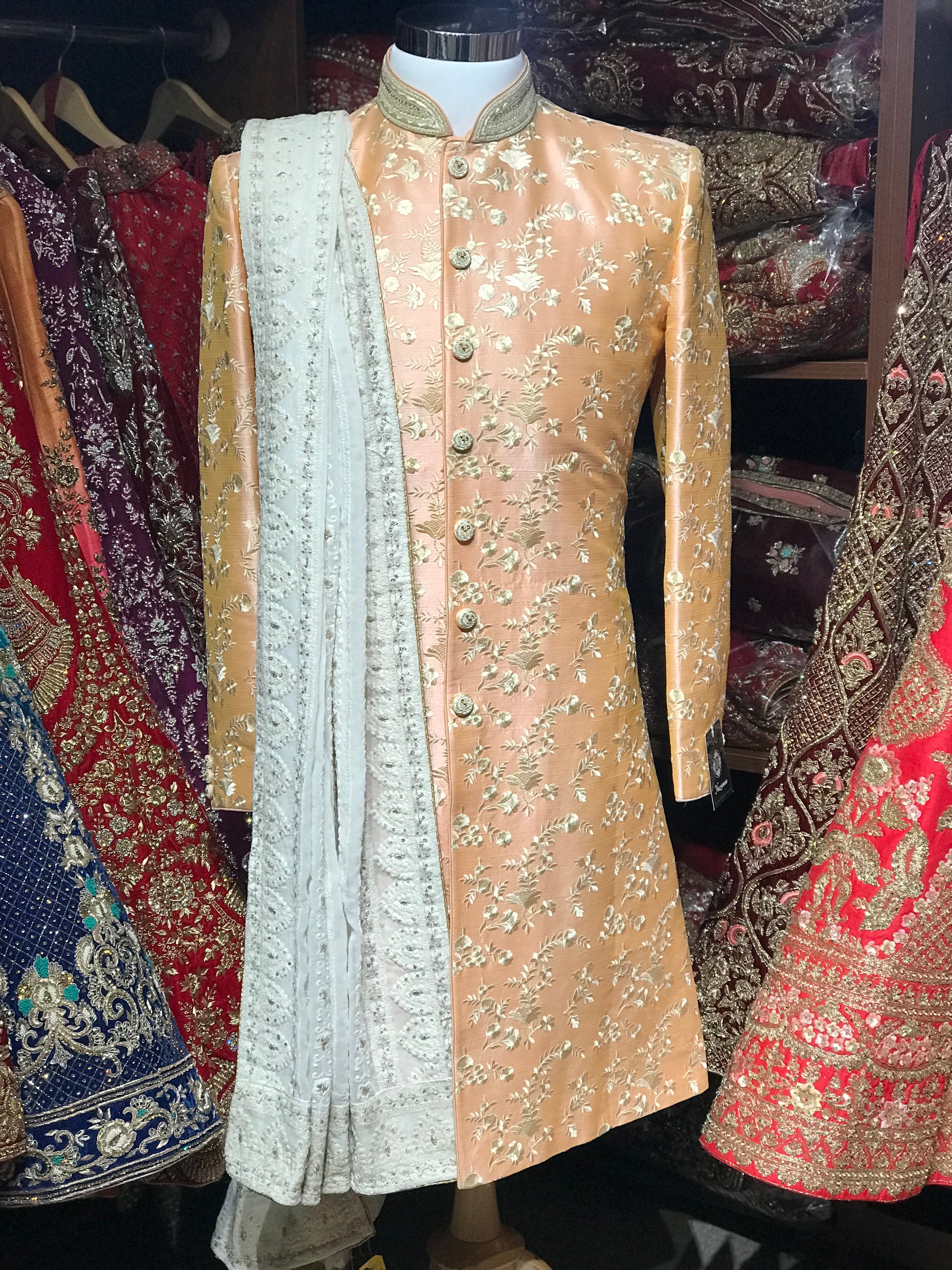 Peach raw silk sherwani with cream resham embroidery. The delicate floral embroidery matches perfectly with a bride’s Lehenga! Paired with a cream chudidar