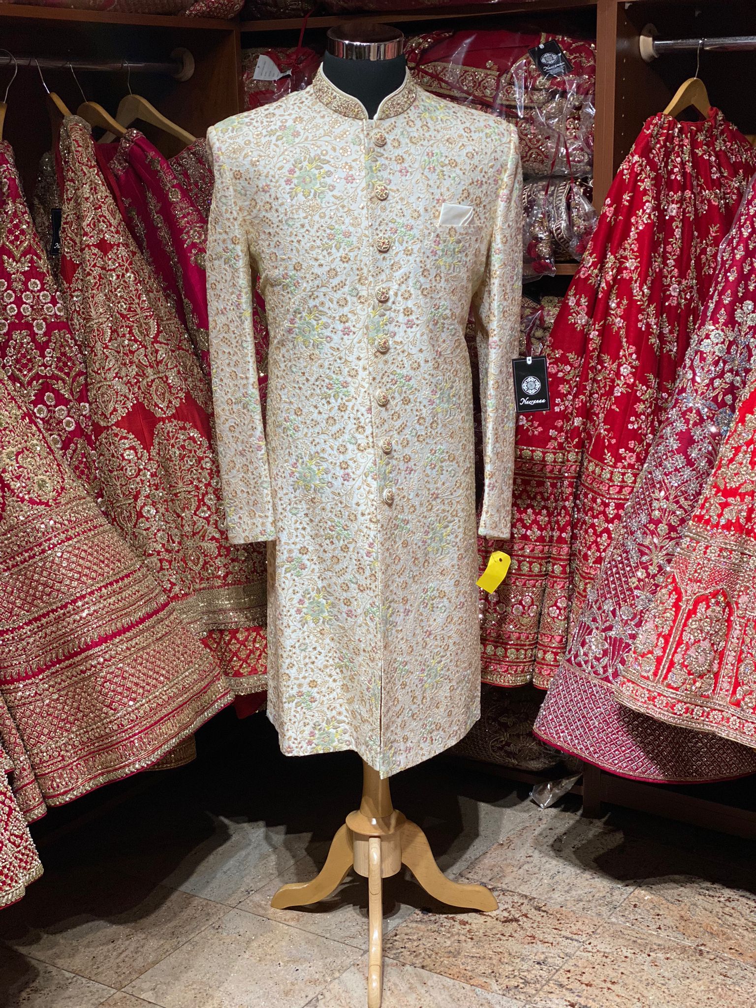 Off white sherwani is embellished in floral patterns with resham, pearl, sequins and cut dana  work in pastel color threads embroidery.This comes along with matching churidar pants.