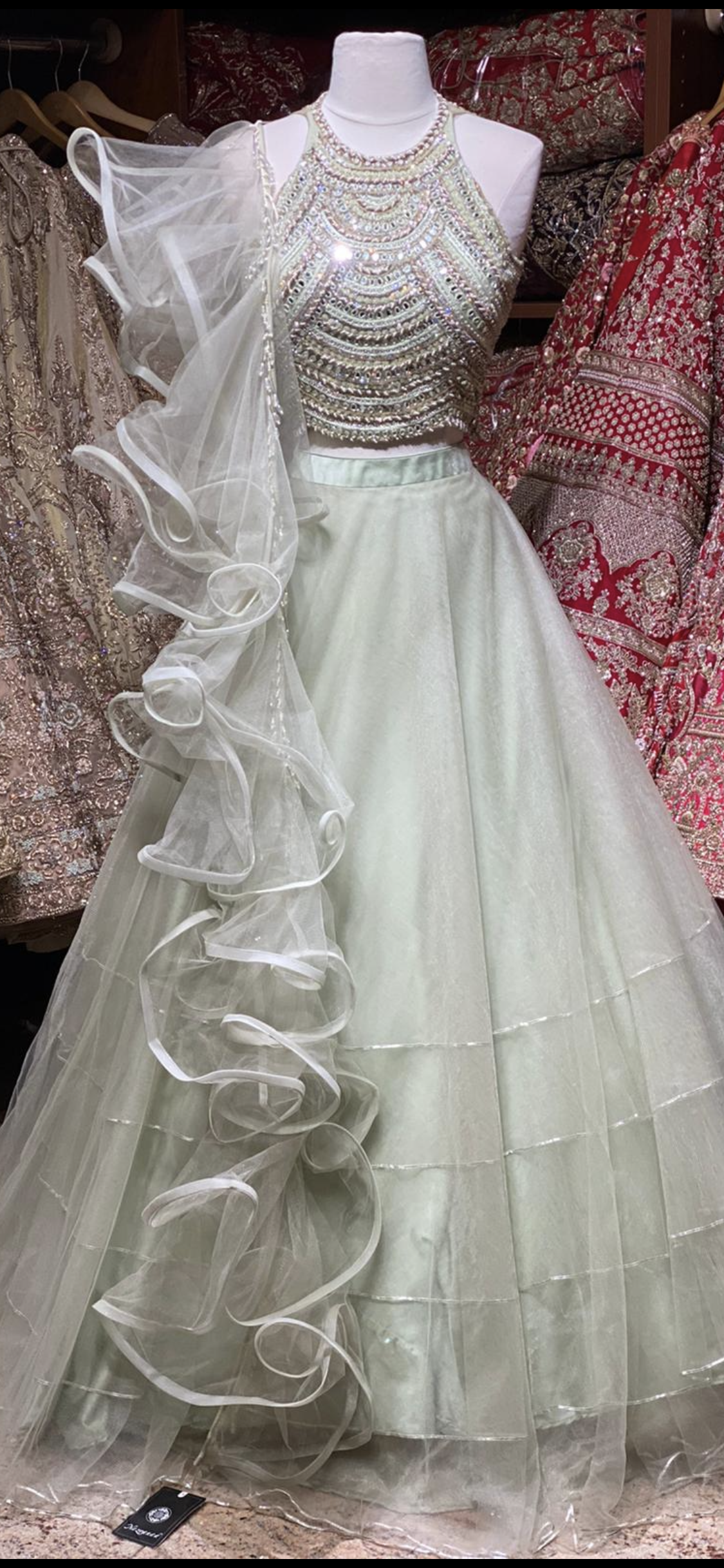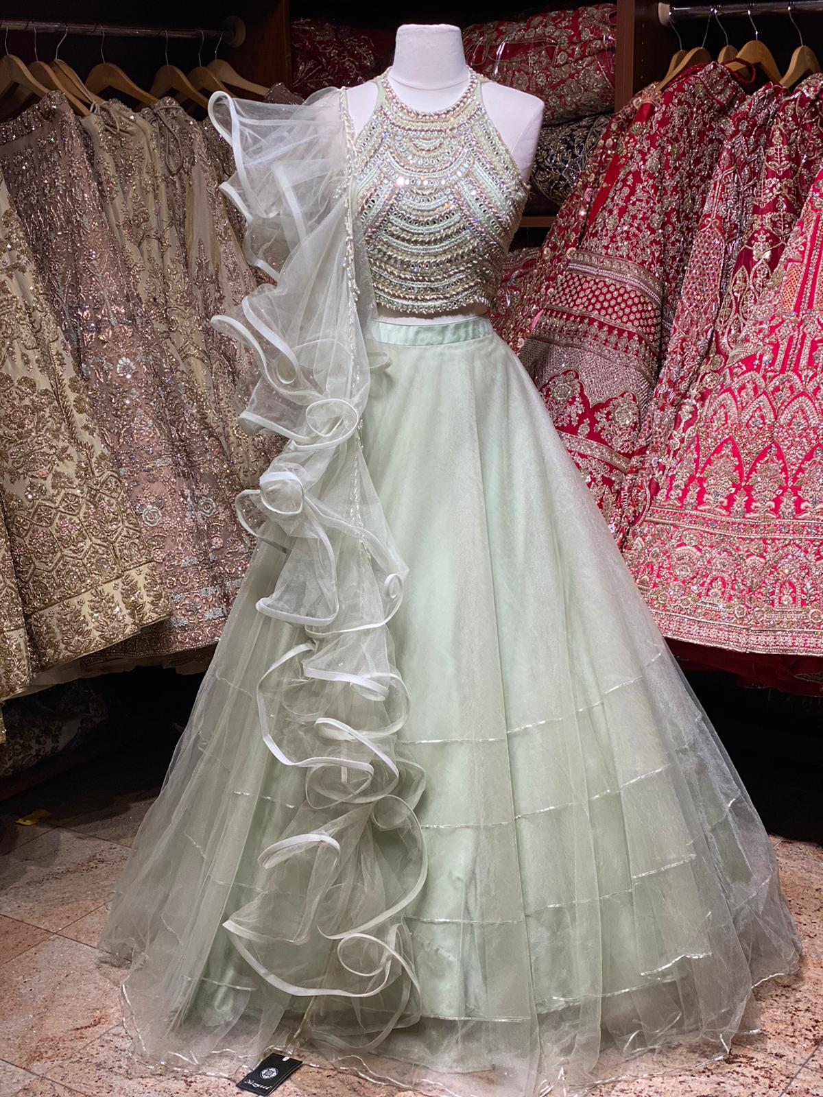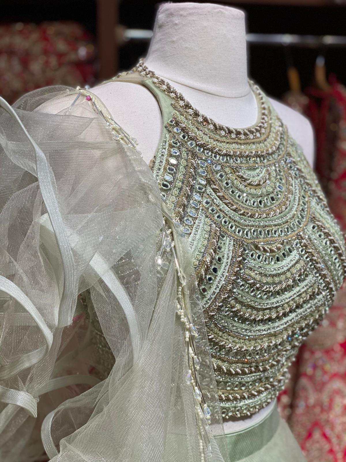 Pistachio green tool lehenga with mirror embroidery and pearl work trendy high neck blouse and statement ruffles dupatta.