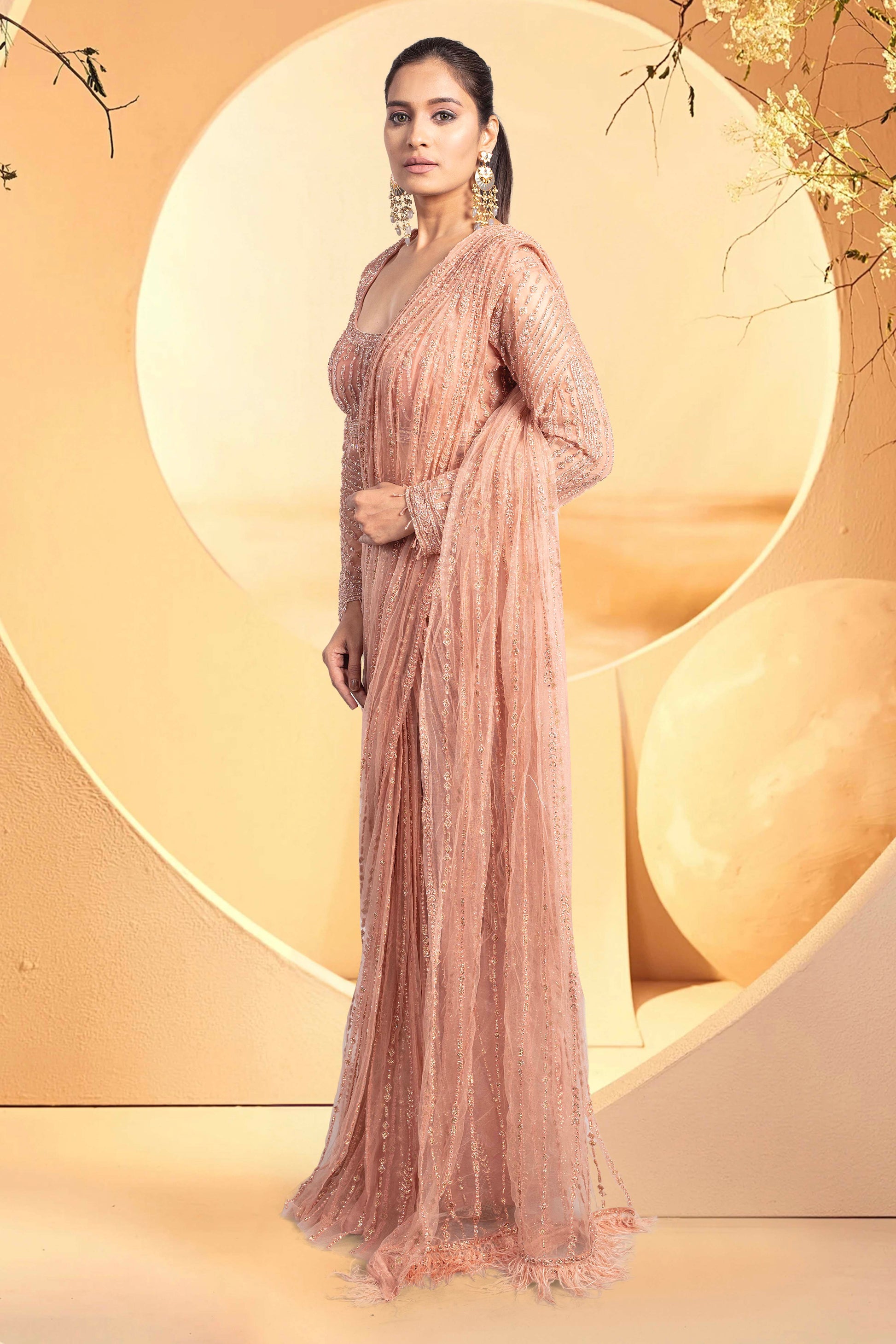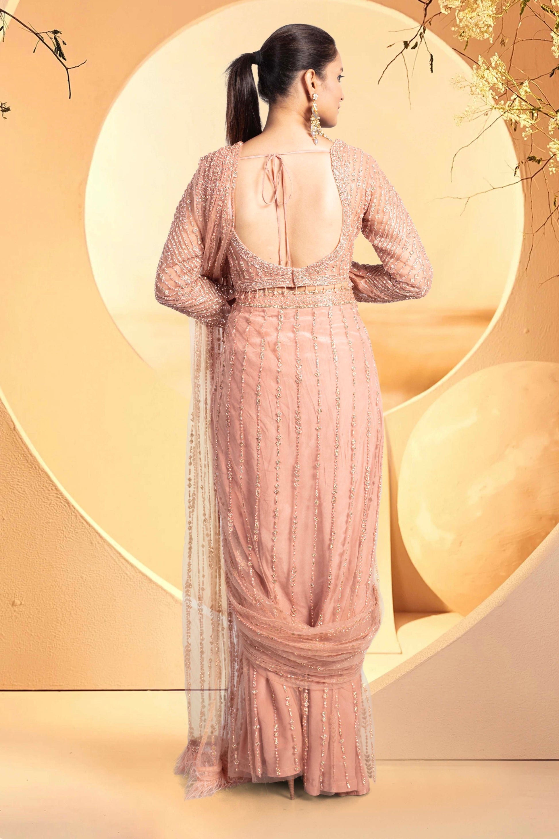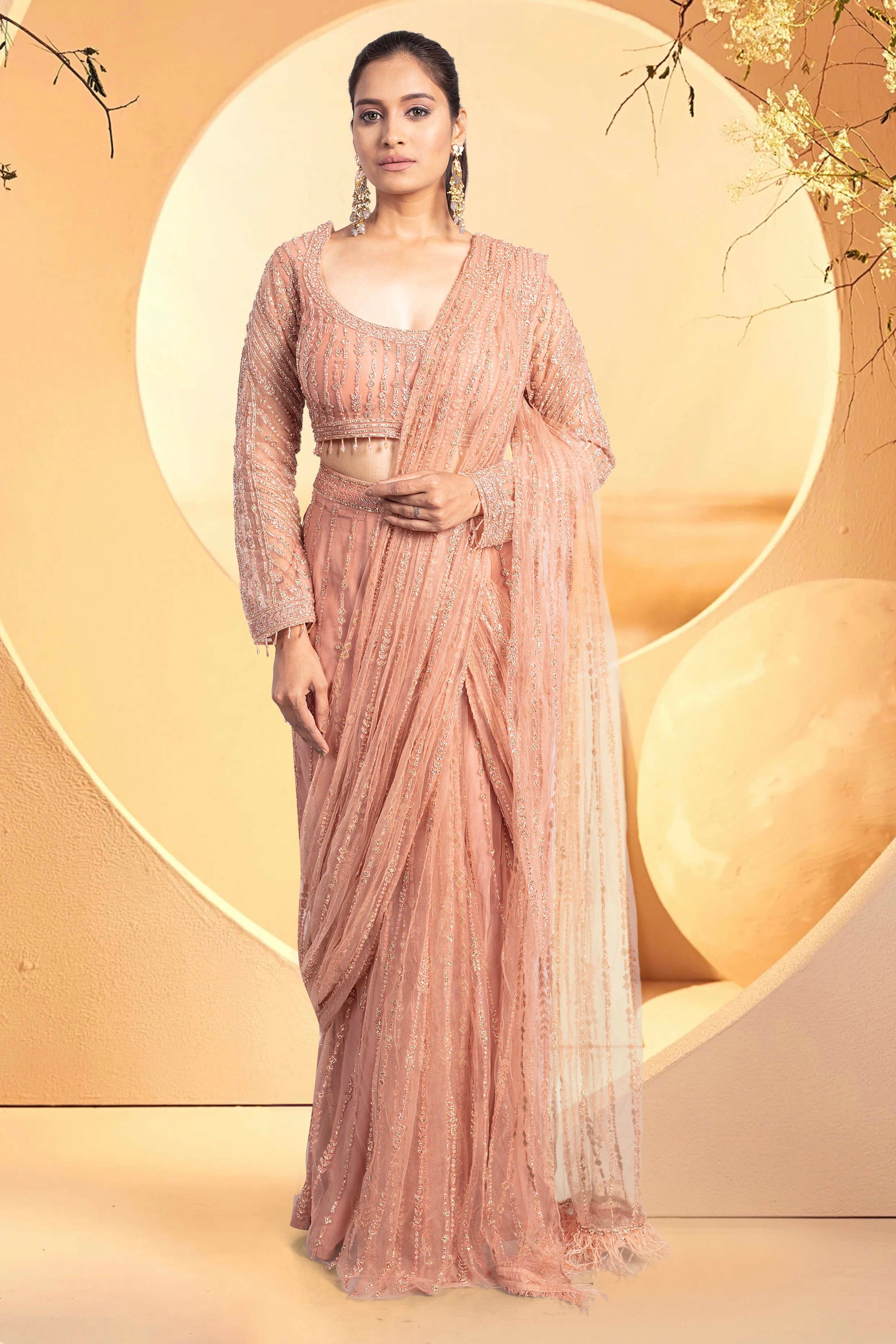 Get ready to rock your next party or wedding event with our Pre-Stitched Saree. Featuring a stunning stone embroidery paired with full sleeve blouse, this saree is perfect for any bride looking to make a statement at their cocktail or reception. Don't settle for a basic saree, stand out and turn heads with this jaw-dropping piece.
