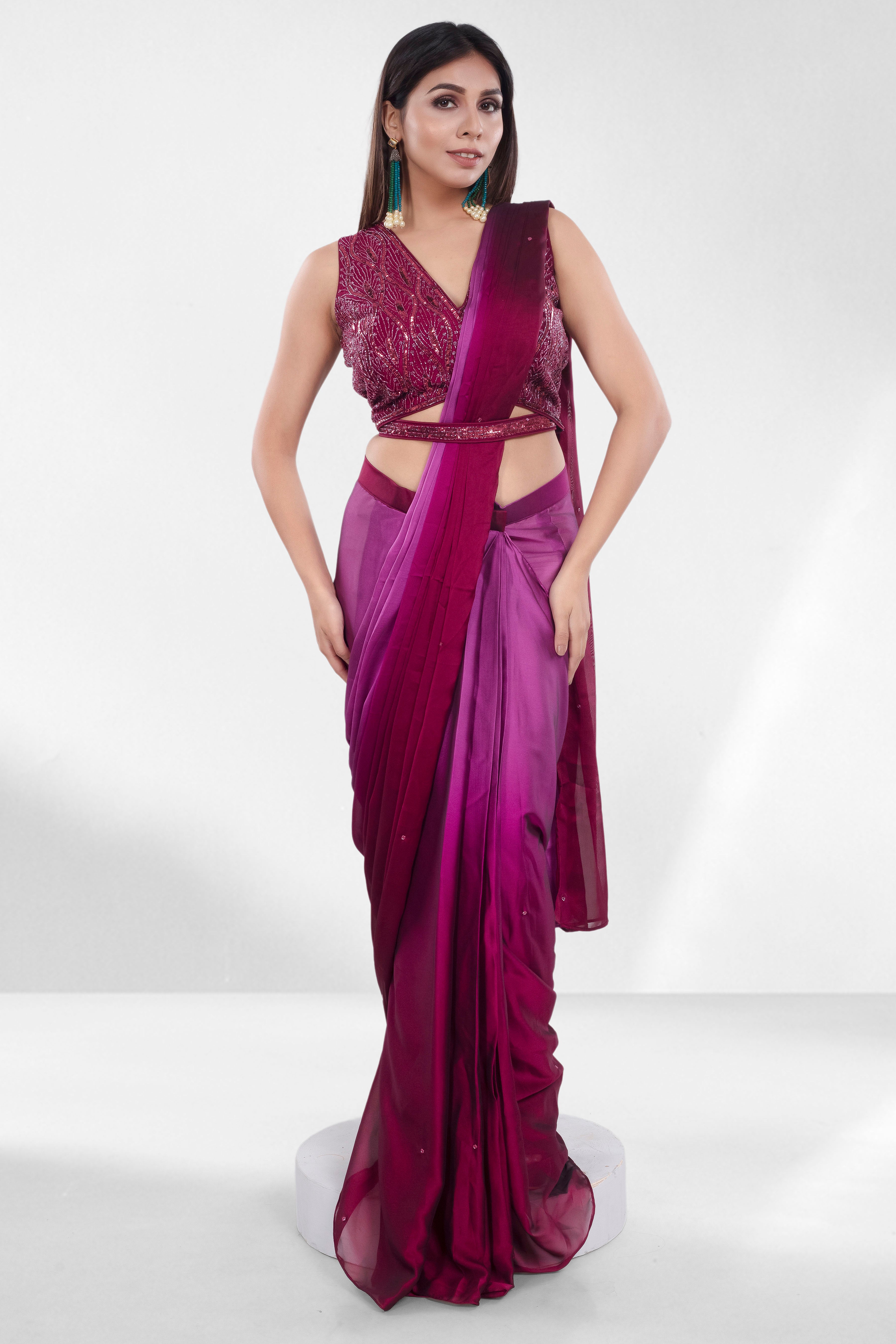 Effortlessly achieve a stylish Indian look with our Pre-Stitched Saree W/ Readymade Blouse - D087. The blouse is adorned with stunning sequin and cutdana, adding a touch of sparkle to your outfit. No need to worry about blouse fitting - it's ready-to-wear for your convenience.
