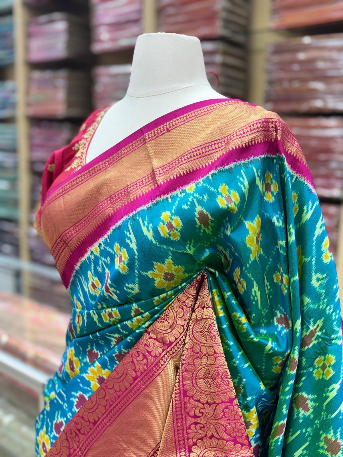 Pure Patola Silk Saree NB-83 Celebrate timeless elegance with this exquisite Pure Patola silk saree, a masterpiece of traditional craftsmanship. Adorned with a striking multicolor and hot pink border, this saree seamlessly blends classic sophistication with contemporary flair. The lustrous silk fabric drapes beautifully, offering both comfort and grace for any occasion. Whether worn at family gatherings, celebrations, or special moments, this versatile piece honors the artistry of authentic Patola weaving while making every mother feel radiant and confident.