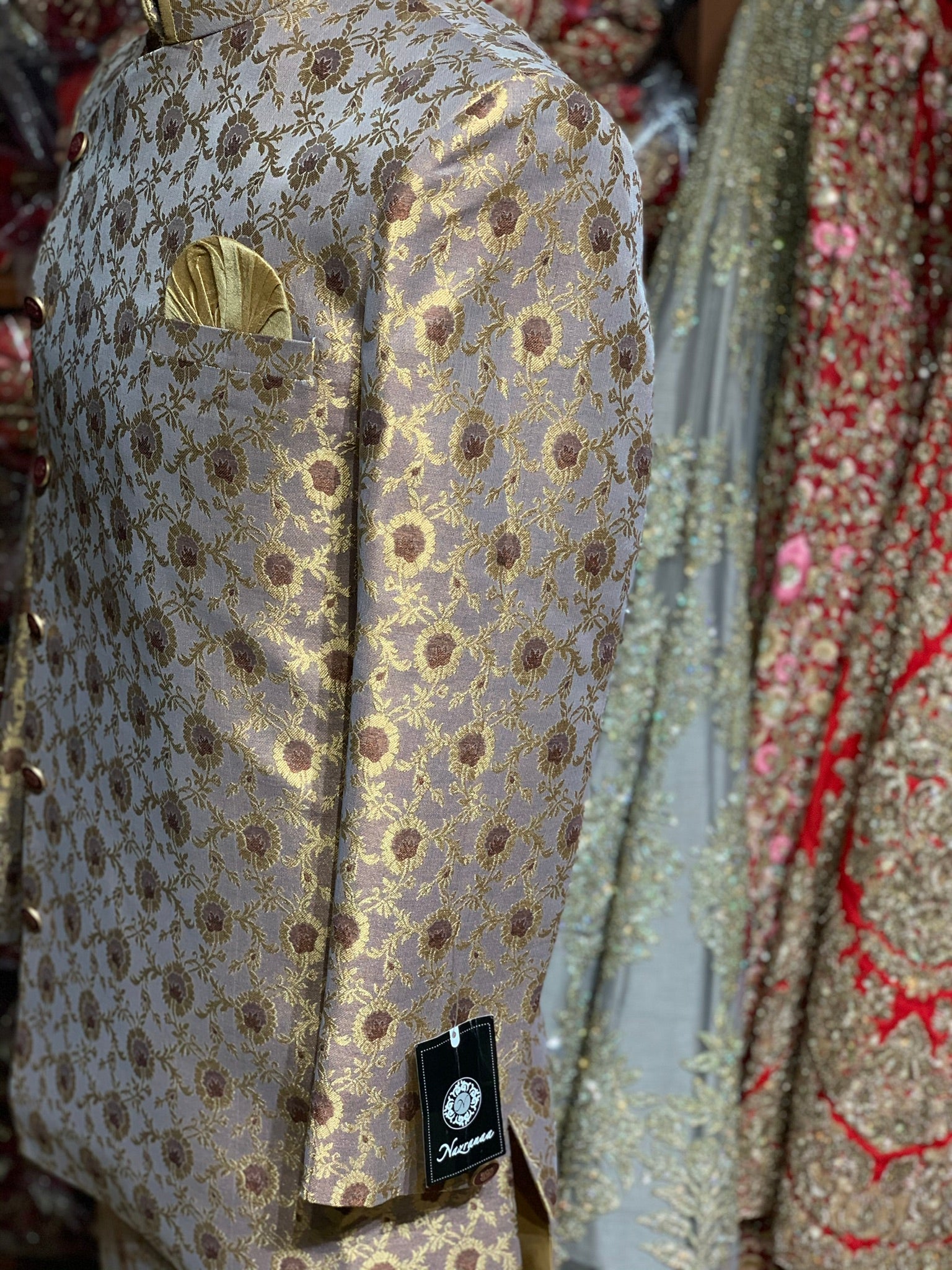 Purple Banarasi Brocade Sherwani with gold buttons and gold chudidar!