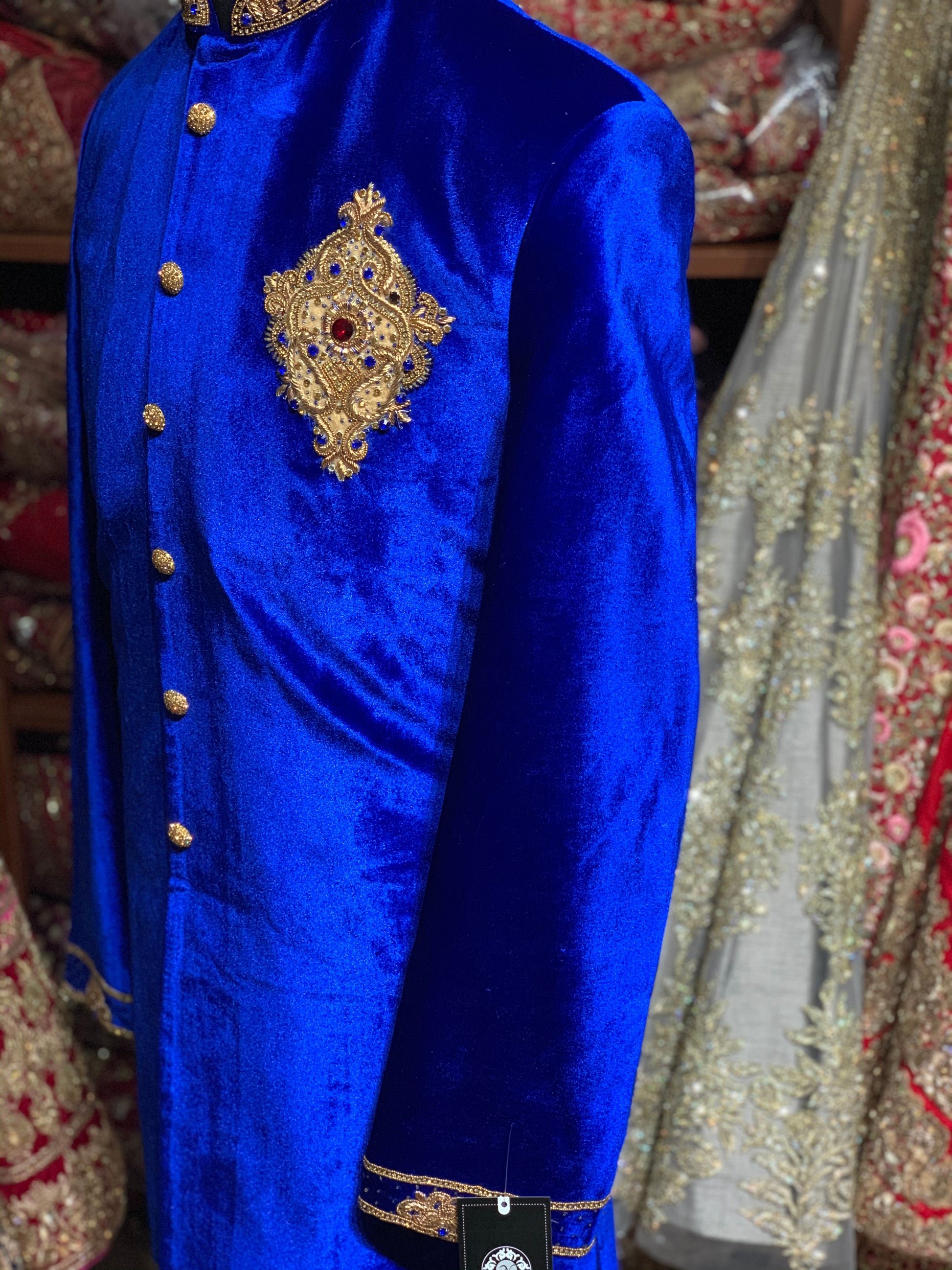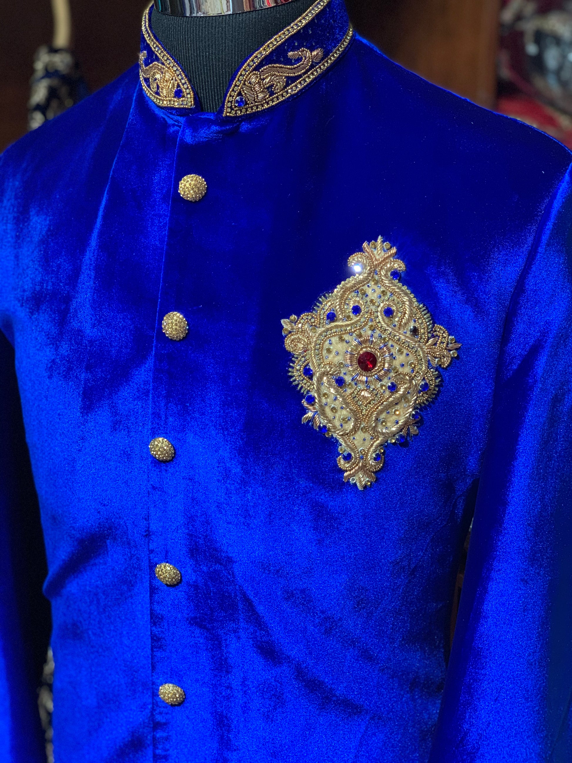 Microvelvet sherwani with gold embroidery and gold stonework buttons