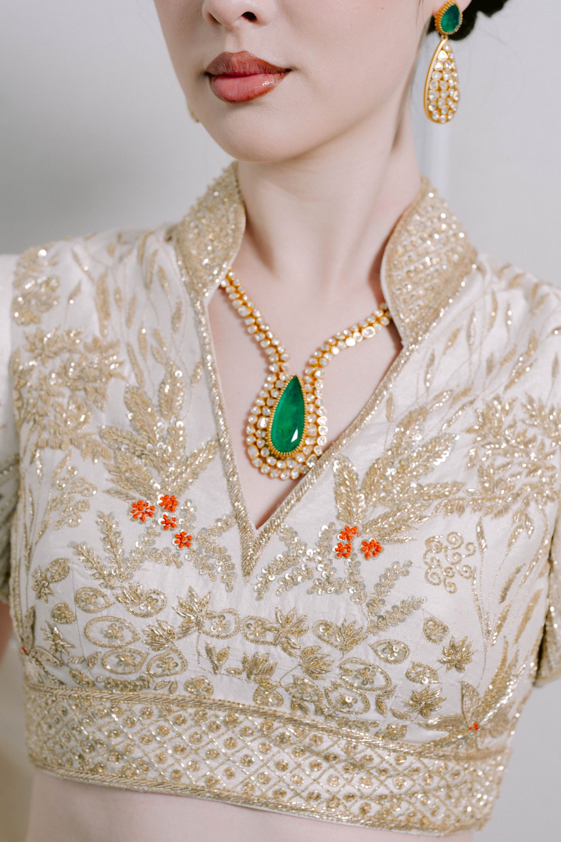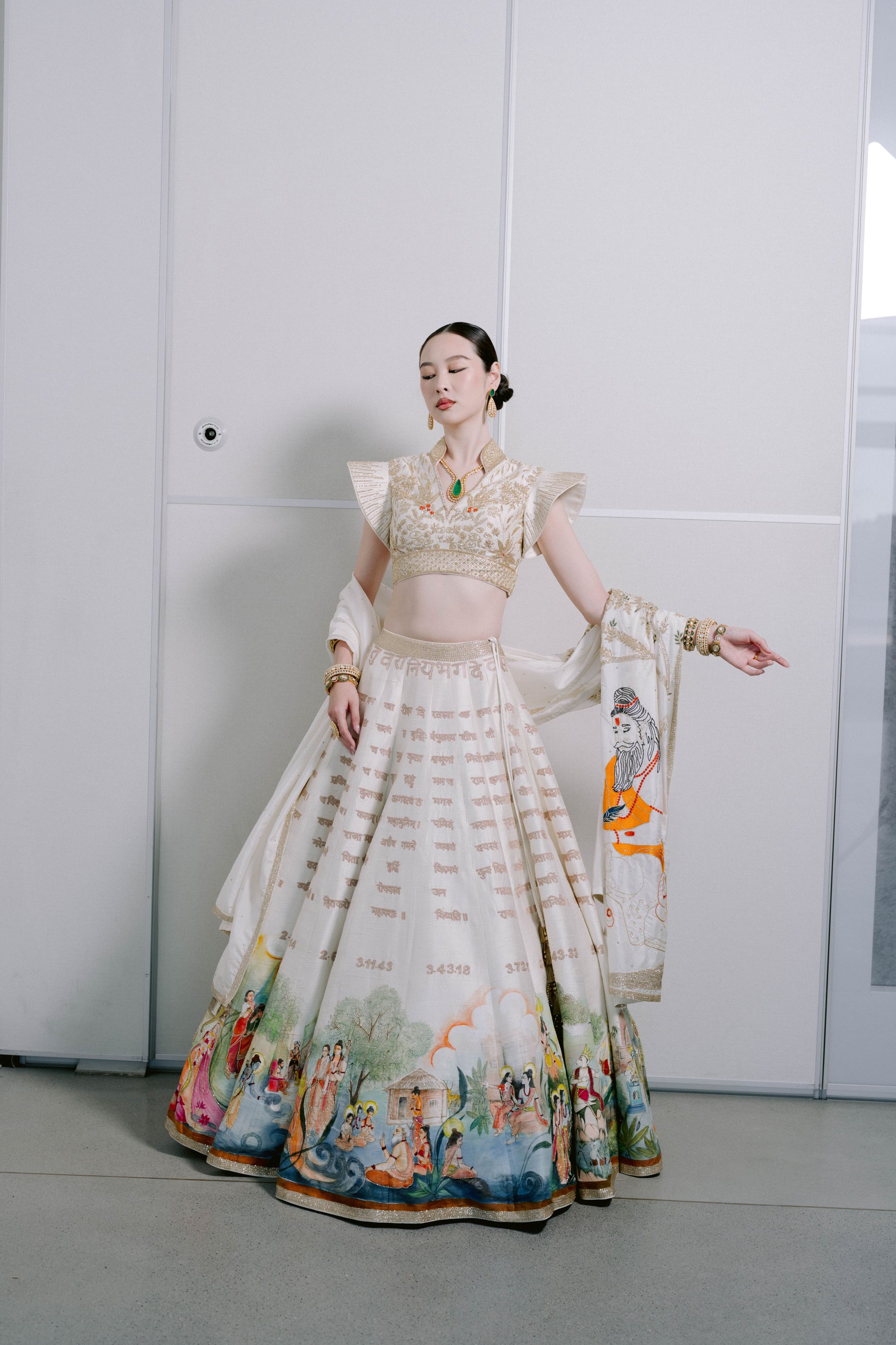 Rishi Valmiki’s genius inspires our showstopper in weaving the Gayatri Mantra into the Ramayana. The 24 syllables of the mantra begin every thousandth verse in the 24,000-verse epic. We translated that into a lehenga with 24 panels — each hand-painted with a story from the Ramayana. On each panel, the syllable of the Gayatri Mantra appears at the top, the corresponding verse runs vertically, and the chapter, or khanda, is marked at the base. It is our way of turning timeless scripture into wearable art.