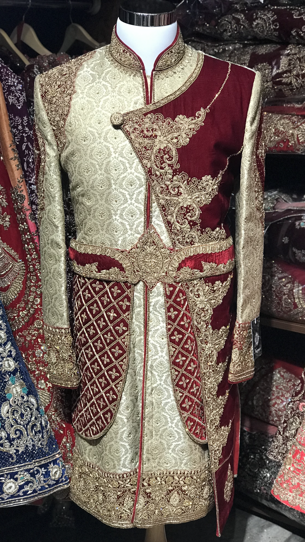 What an amazing cut!! A gold sherwani with red velvet patching and amazing hand embroidery! Made with zardosi and crystals this is an absolutely masterpiece! Paired with a gold chudidar and velvet belt!