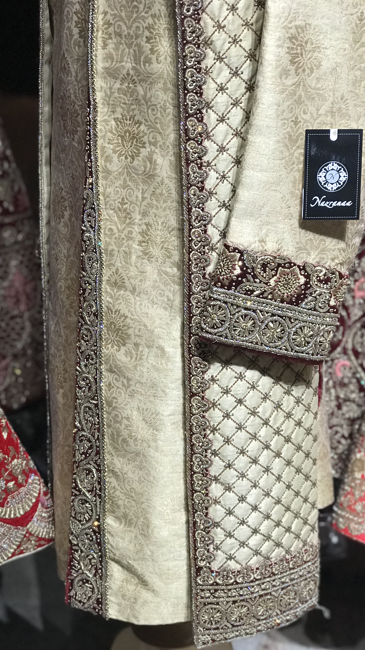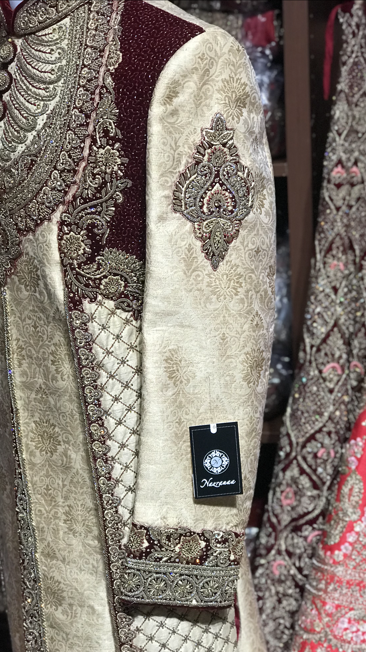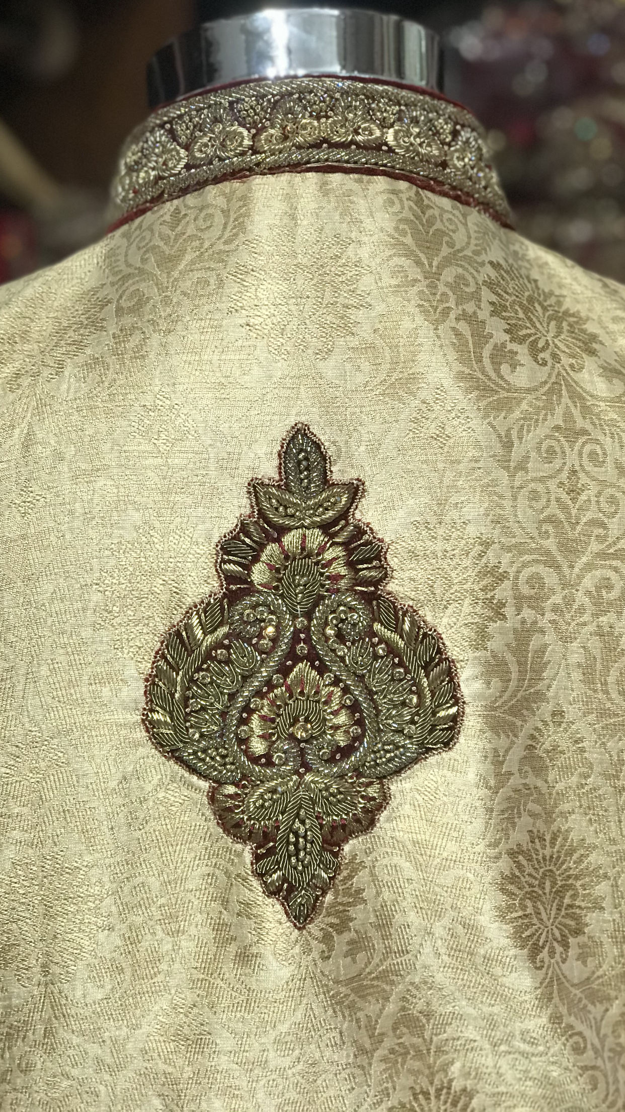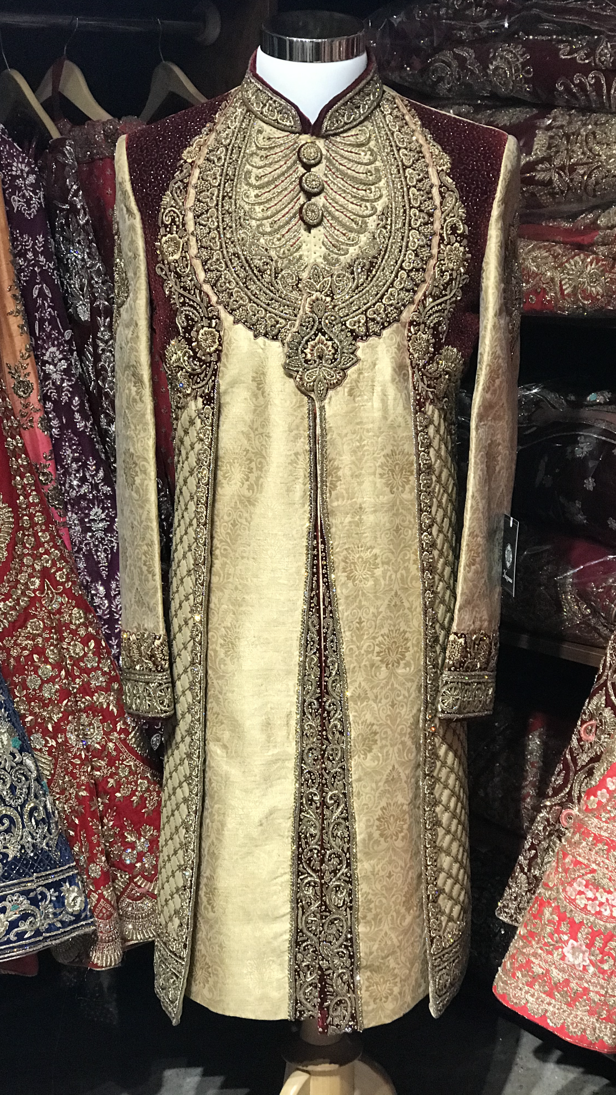 A beautifully made gold brocade sherwani with rich hand embroidery and velvet patching! Contrasted with maroon velvet and maroon chudidar!