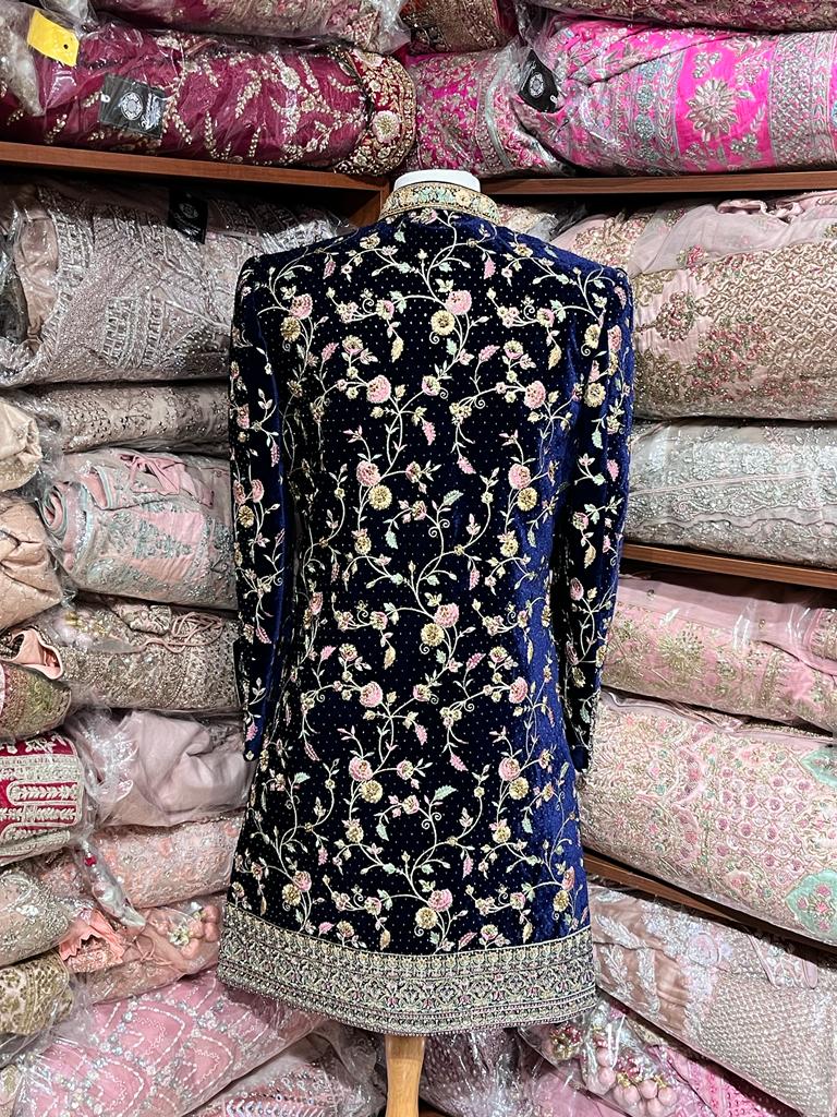 Royal Blue Velvet Thread Embroidered Sherwani-S13-94