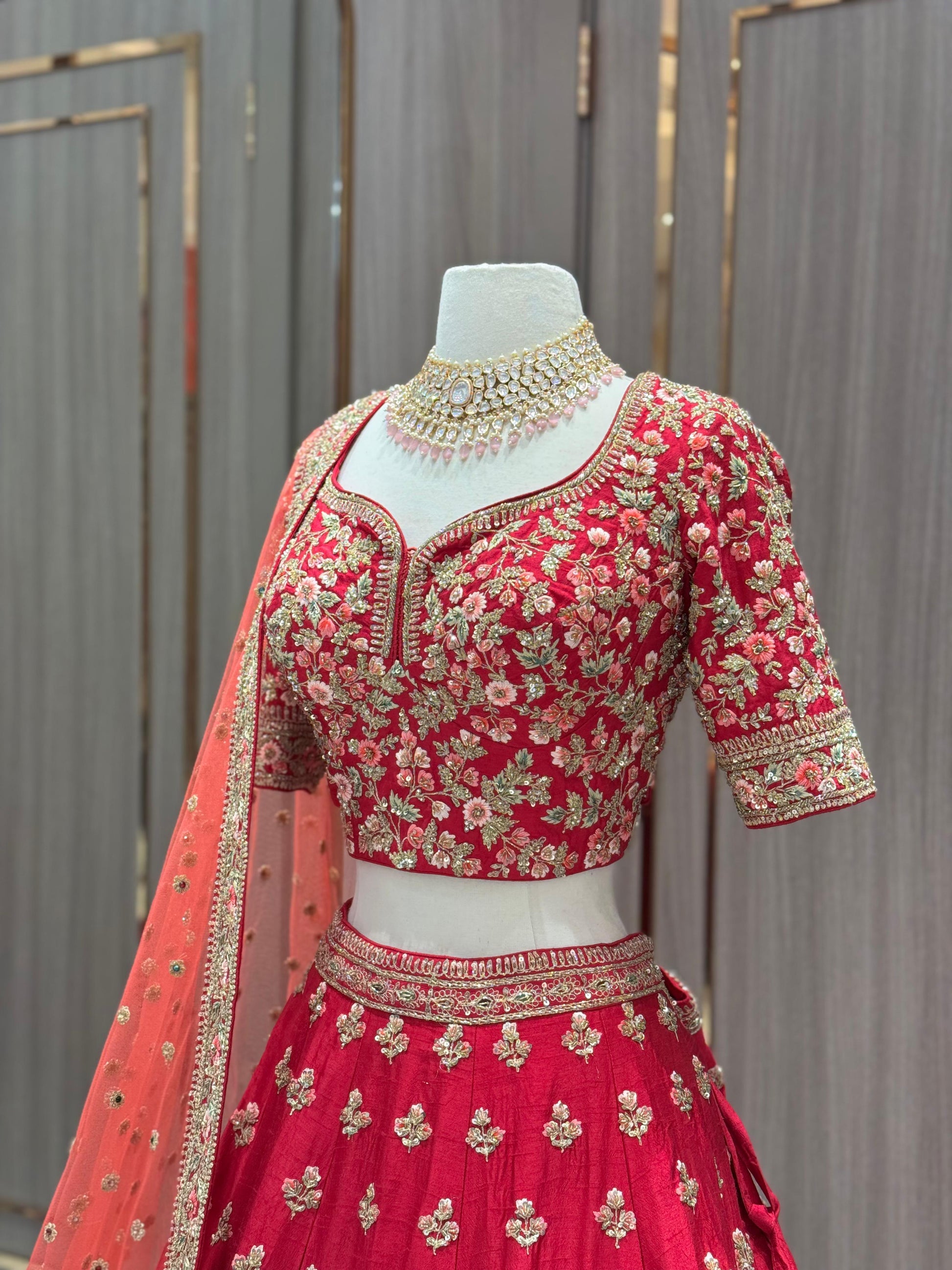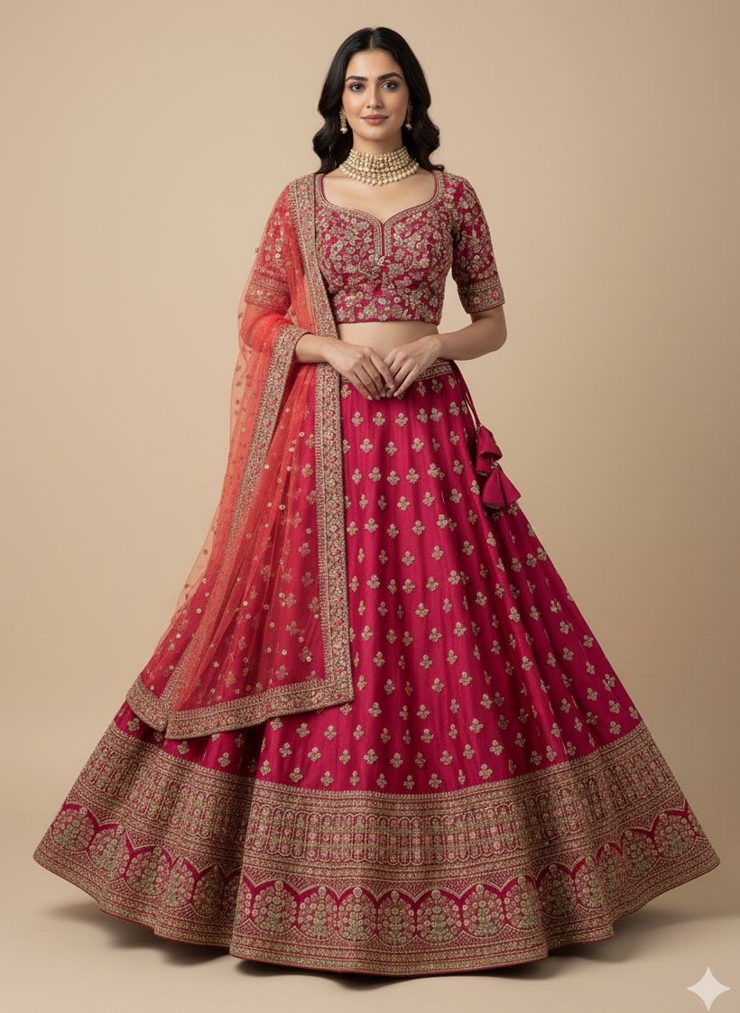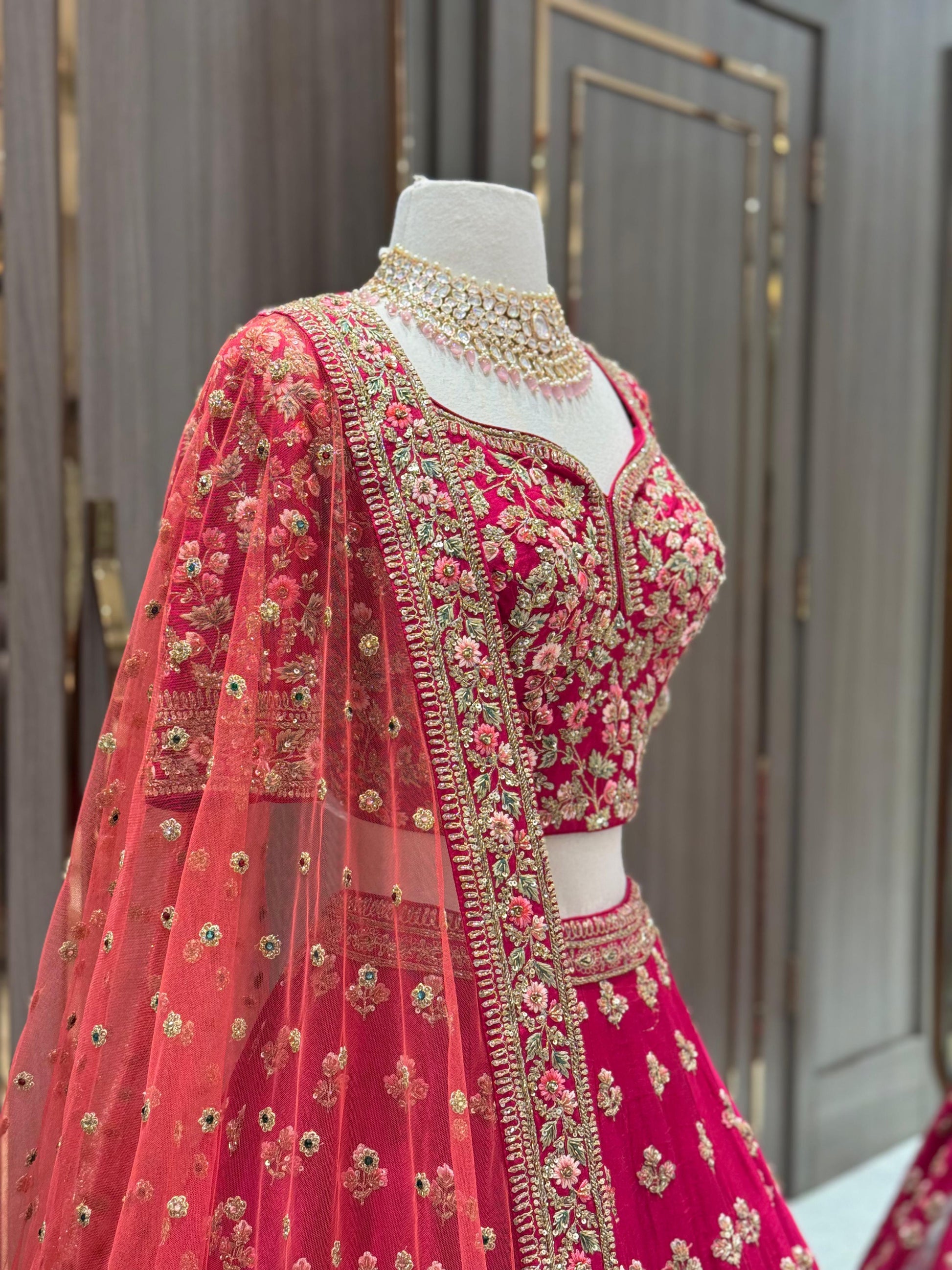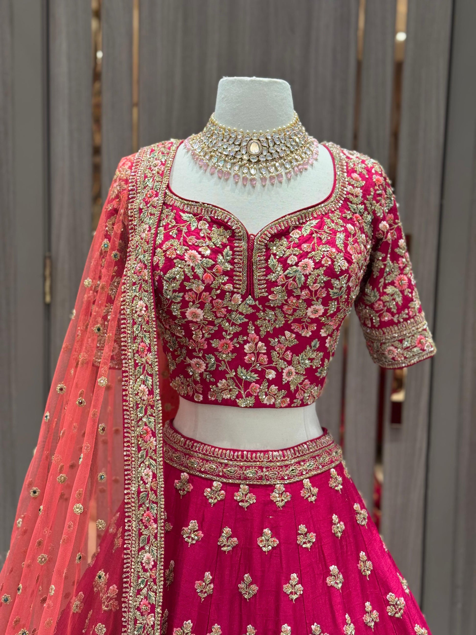 Unleash your bold side with our JUNE MADNESS ONLINE EXCLUSIVE- 013! This vibrant pink bridal wear features a stylish multicolor thread border with intricate butties all over the skirt. Complete the look with the peach orange dupatta, perfect for the daring sister of the bride or groom. Get ready to make a statement at any wedding or special occasion with this unique piece!