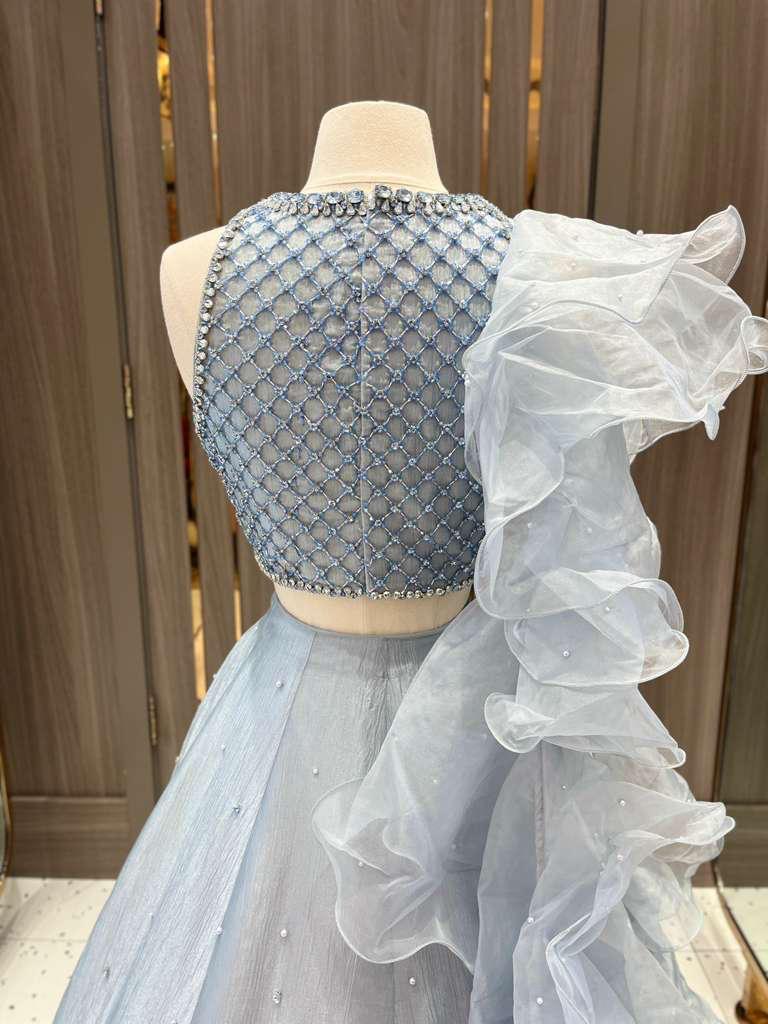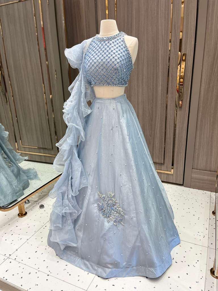 Fresh, refined, and luminous – this Dhruva Collection lehenga is an ode to modern elegance. The crystal-checked blouse, dreamy powder-blue skirt with delicate floral embroidery, and whimsical ruffled dupatta come together to create a look that is effortlessly chic and endlessly memorable.