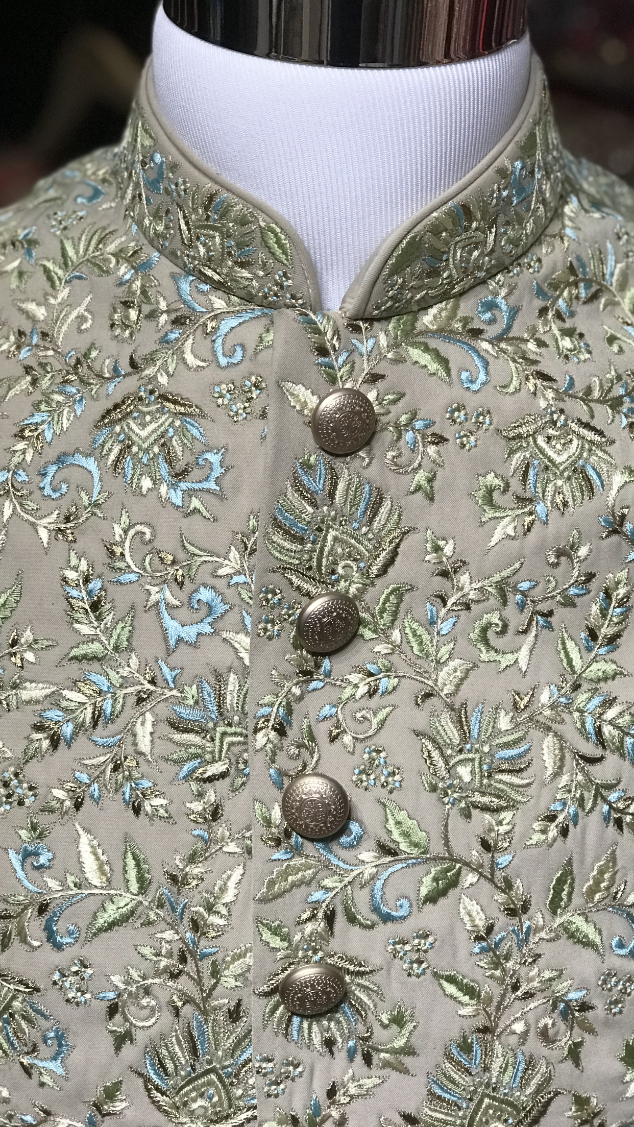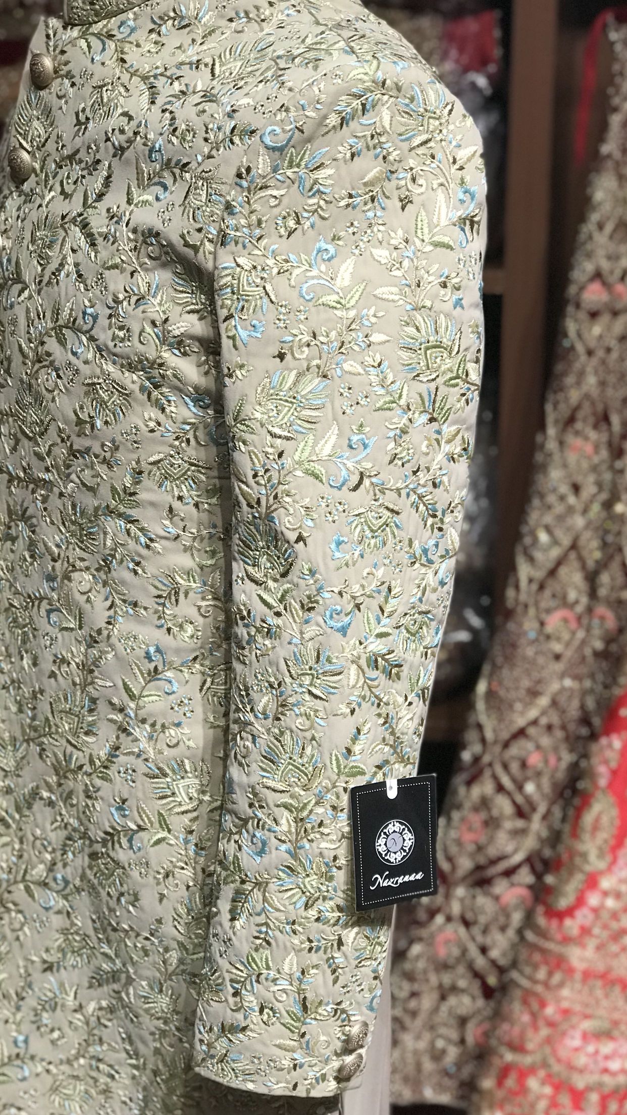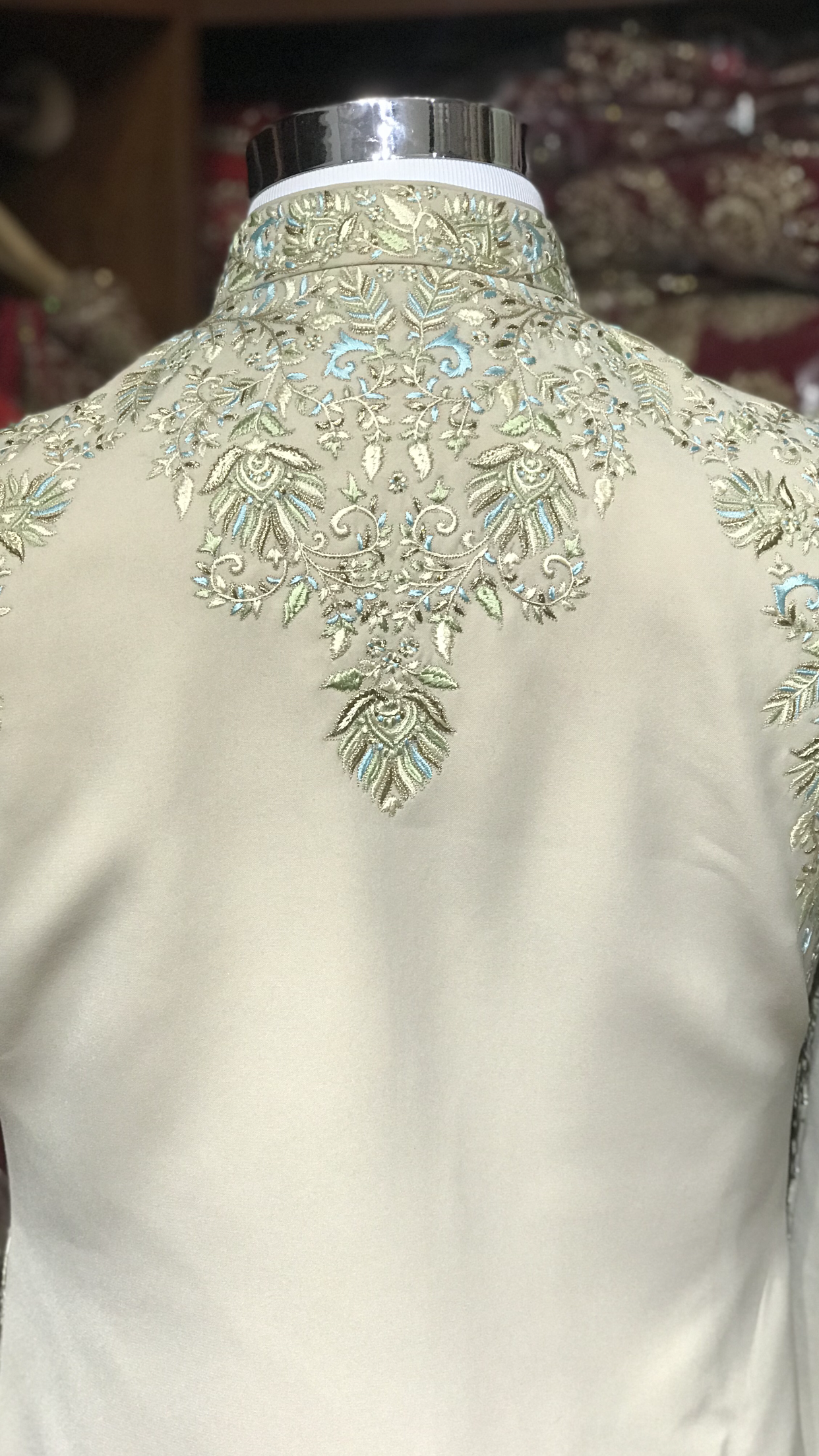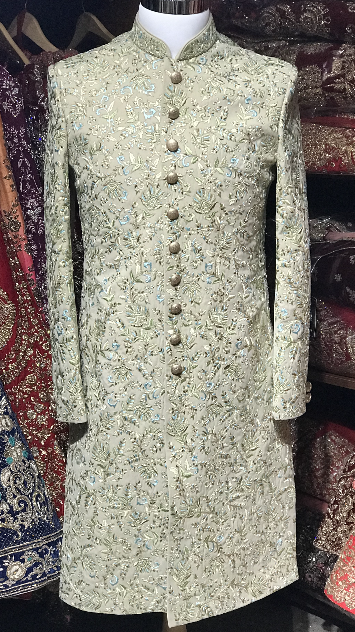 Sage silk sherwani with paisley design embroidery achieved with different resham colors including blue and green! Paired with an ivory chudidar!