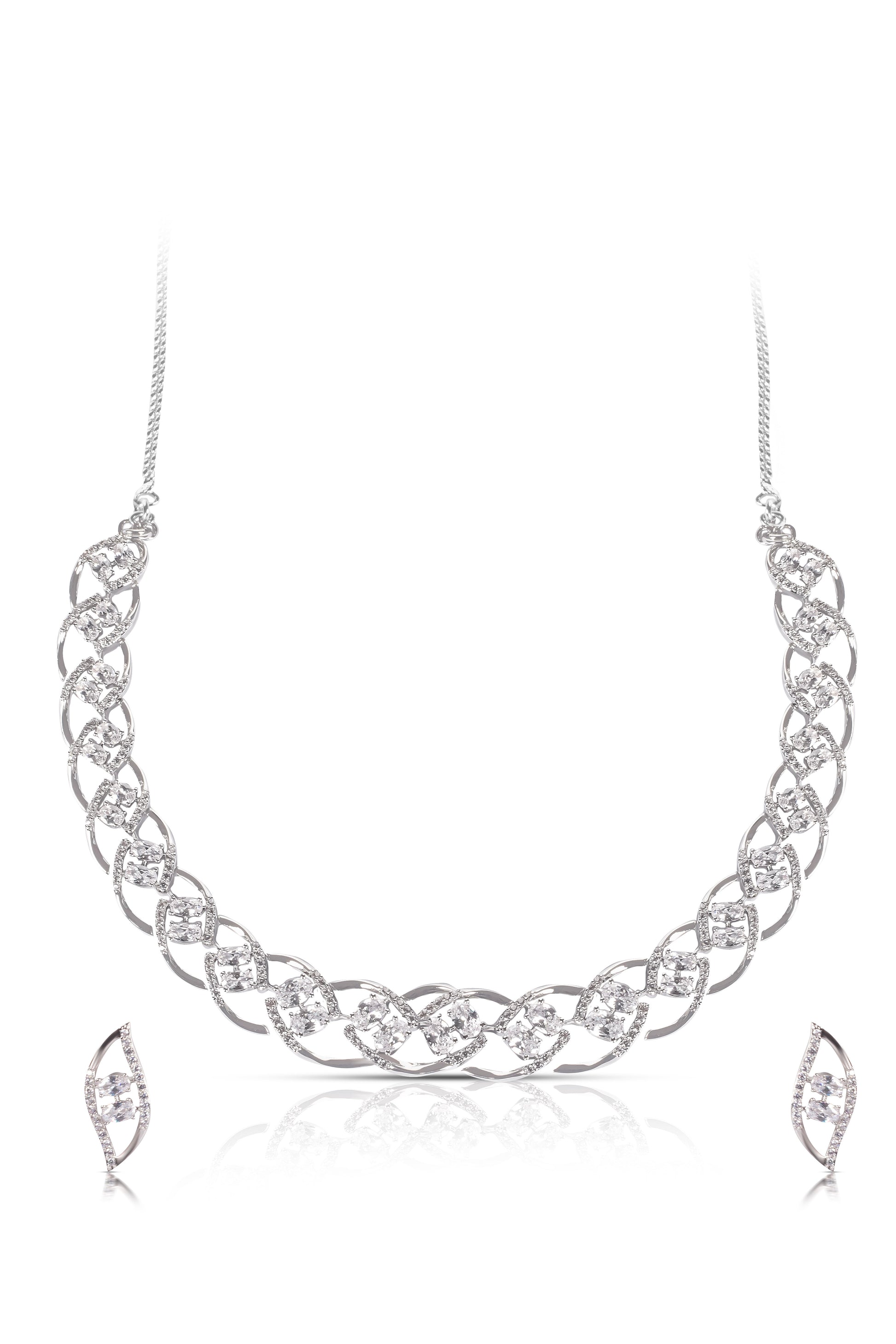Silver Diamond Navette Necklace Set is a perfect accessory for any night event. It is sure to make you stand out in a crowded room.
