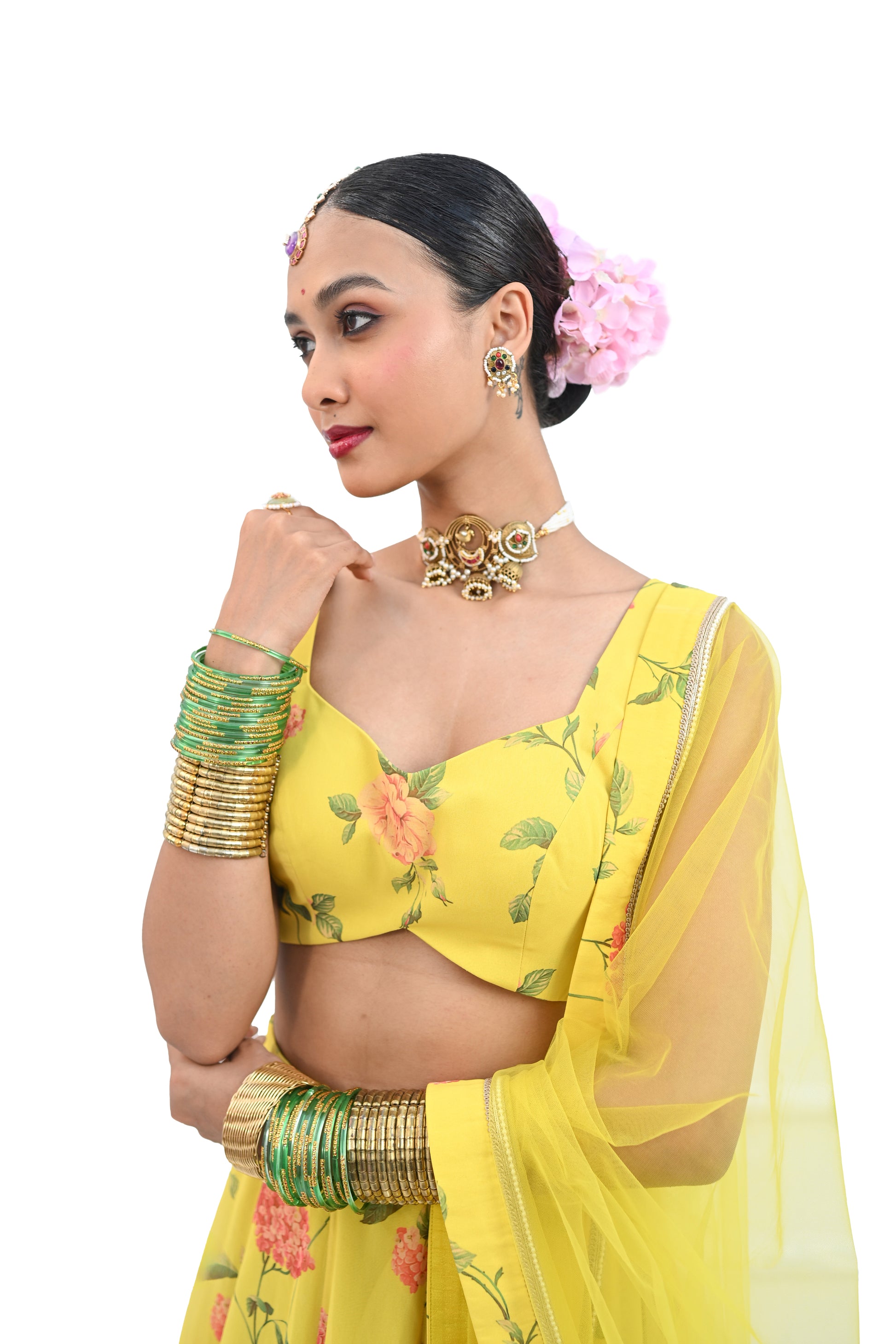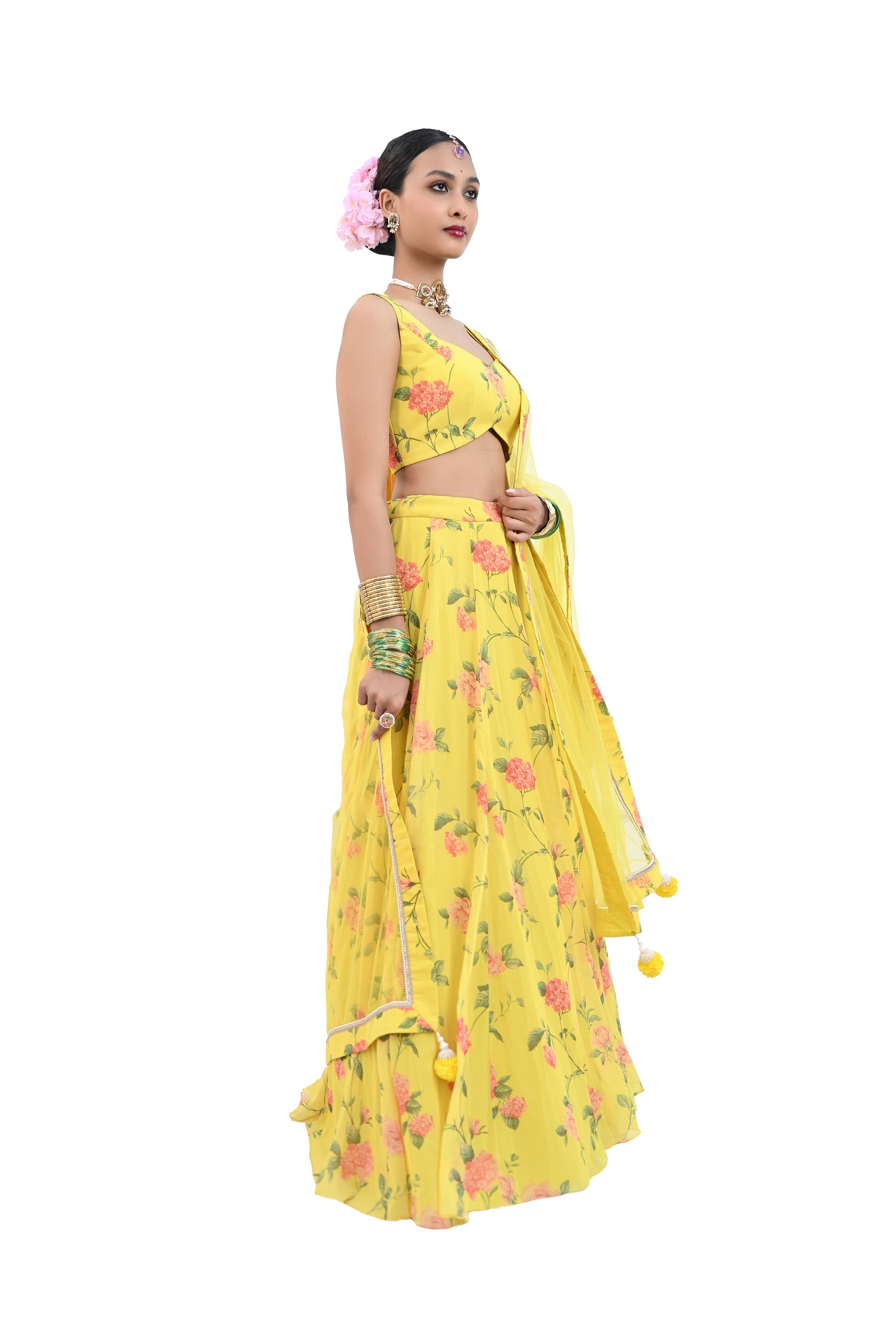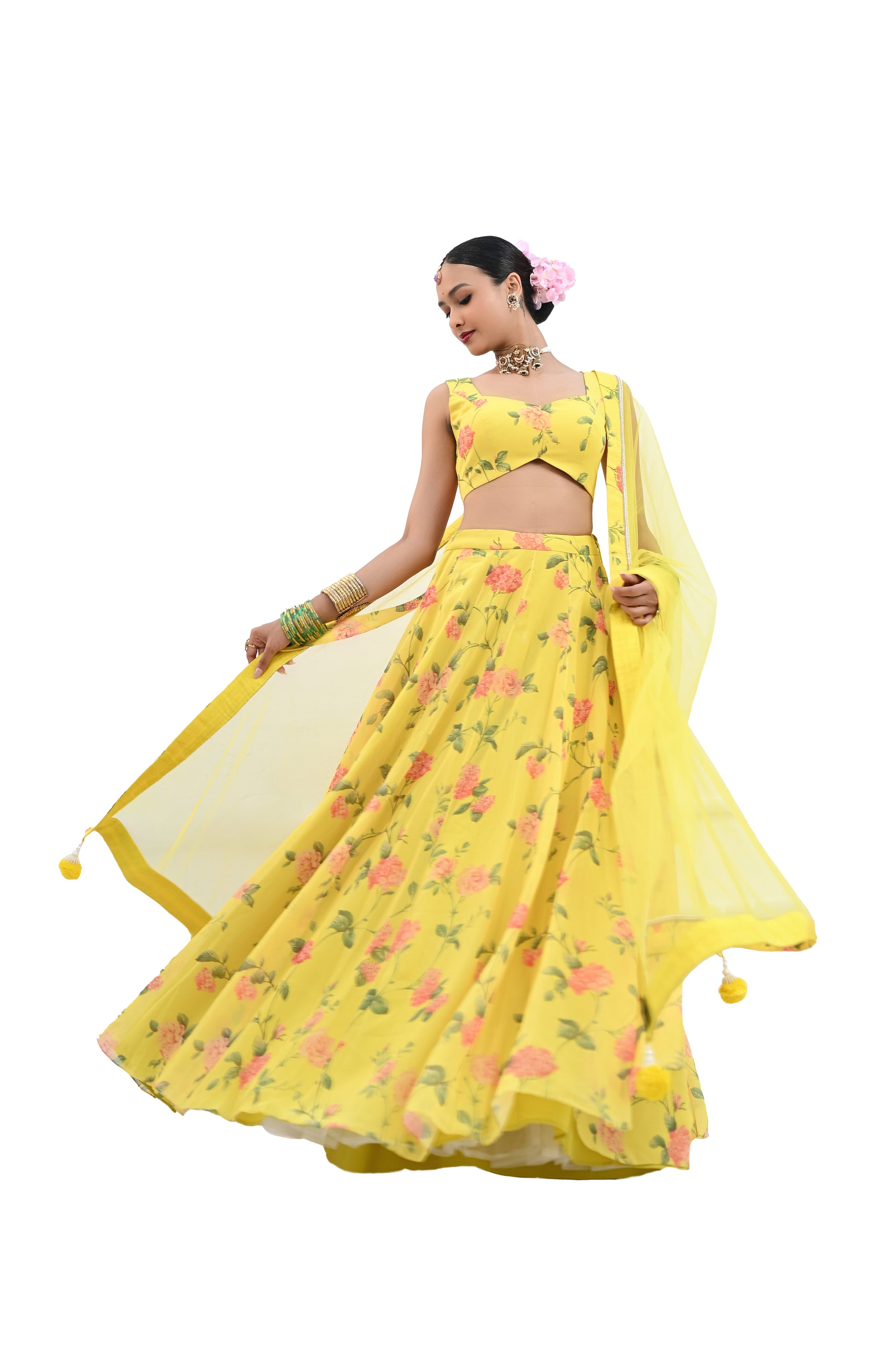 Pankhudi isn’t just an outfit—it’s a moment. Paired here with a soft, light yellow net dupatta, Designed for the bride who wants her haldi look to live rent-free in everyone’s minds forever.