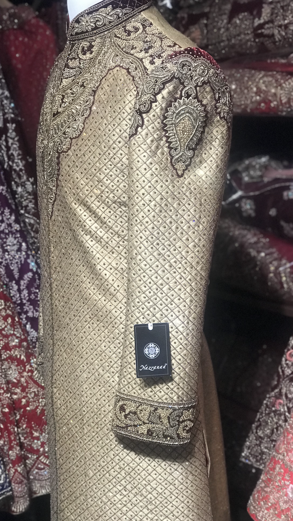 As the name suggests this is made for the royal groom! Gold raw silk sherwani with all over lattice embroidery and maroon velvet patching with heavy hand embroidery. Contrasted with a maroon chudidar. The dupatta is not a part of the sherwani and can be purchased separately.