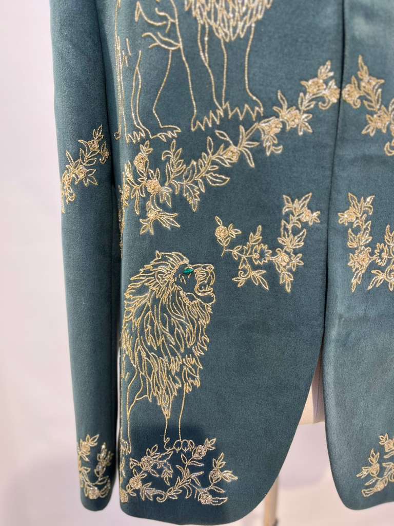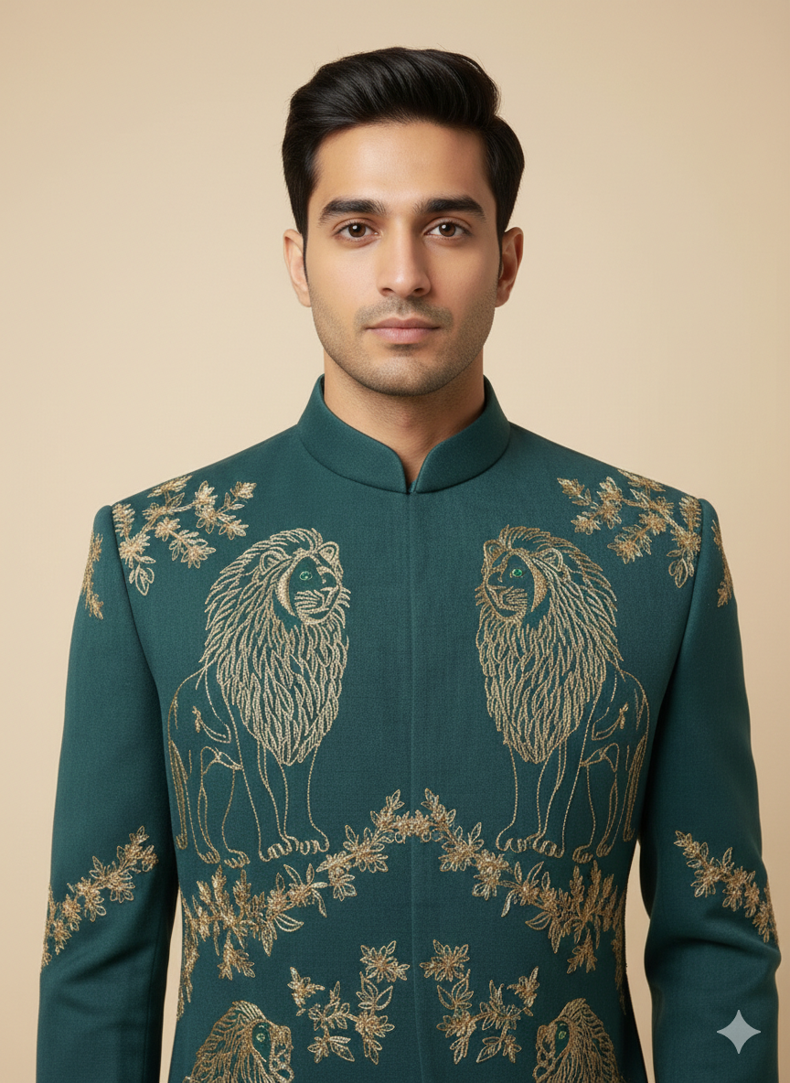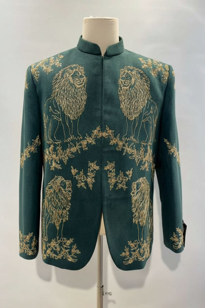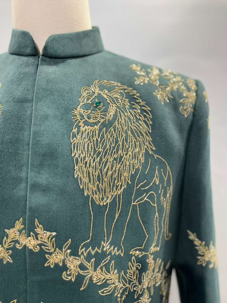 This emerald green bandhgala set blends regal elegance with modern tailoring. Crafted in a rich, luxurious fabric, the jacket features intricate gold cut dana work with majestic lion motifs and delicate floral vines, symbolizing strength and royalty. Subtle green stone detailing adds depth without overpowering the design. Finished with a clean mandarin collar and a sharp, structured fit, the outfit is paired with matching pants for a polished look. Perfect for grooms, receptions, and statement wedding events.