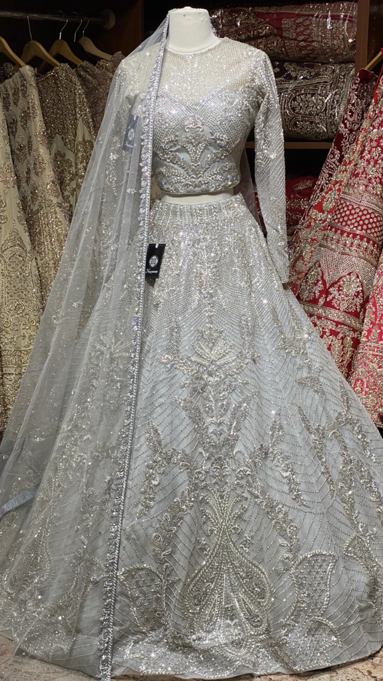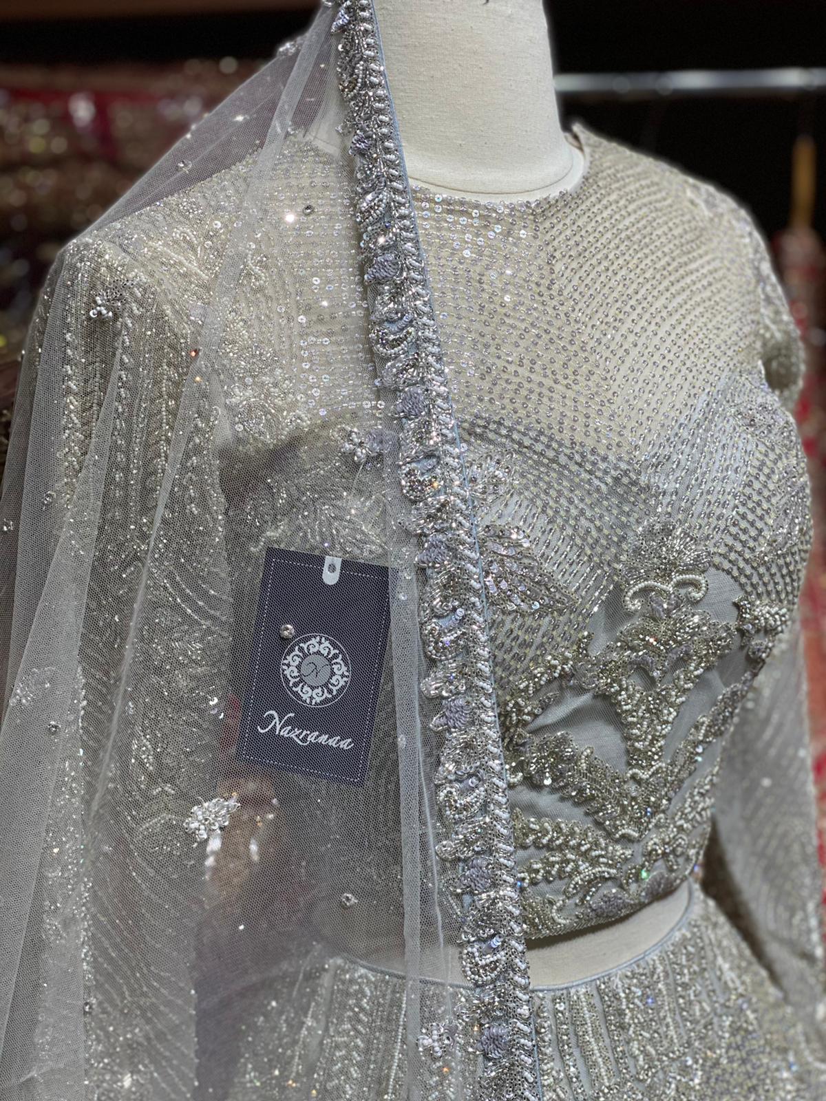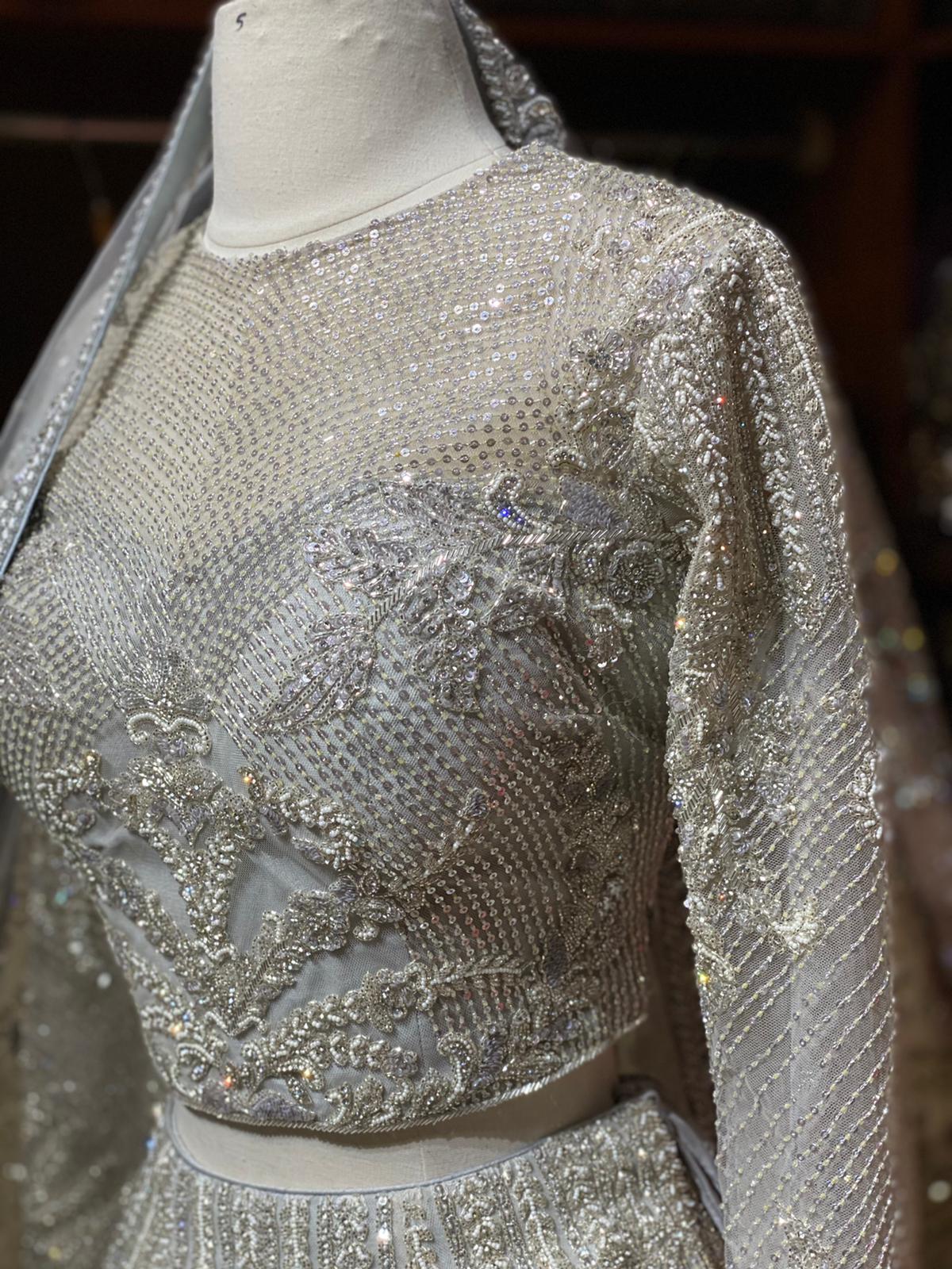 Cloudy grey intricate with fully sequence, studs motifs thread embroidery and crystal stone work  lehenga embellished with pearl design paired with high neck blouse and net dupatta.
