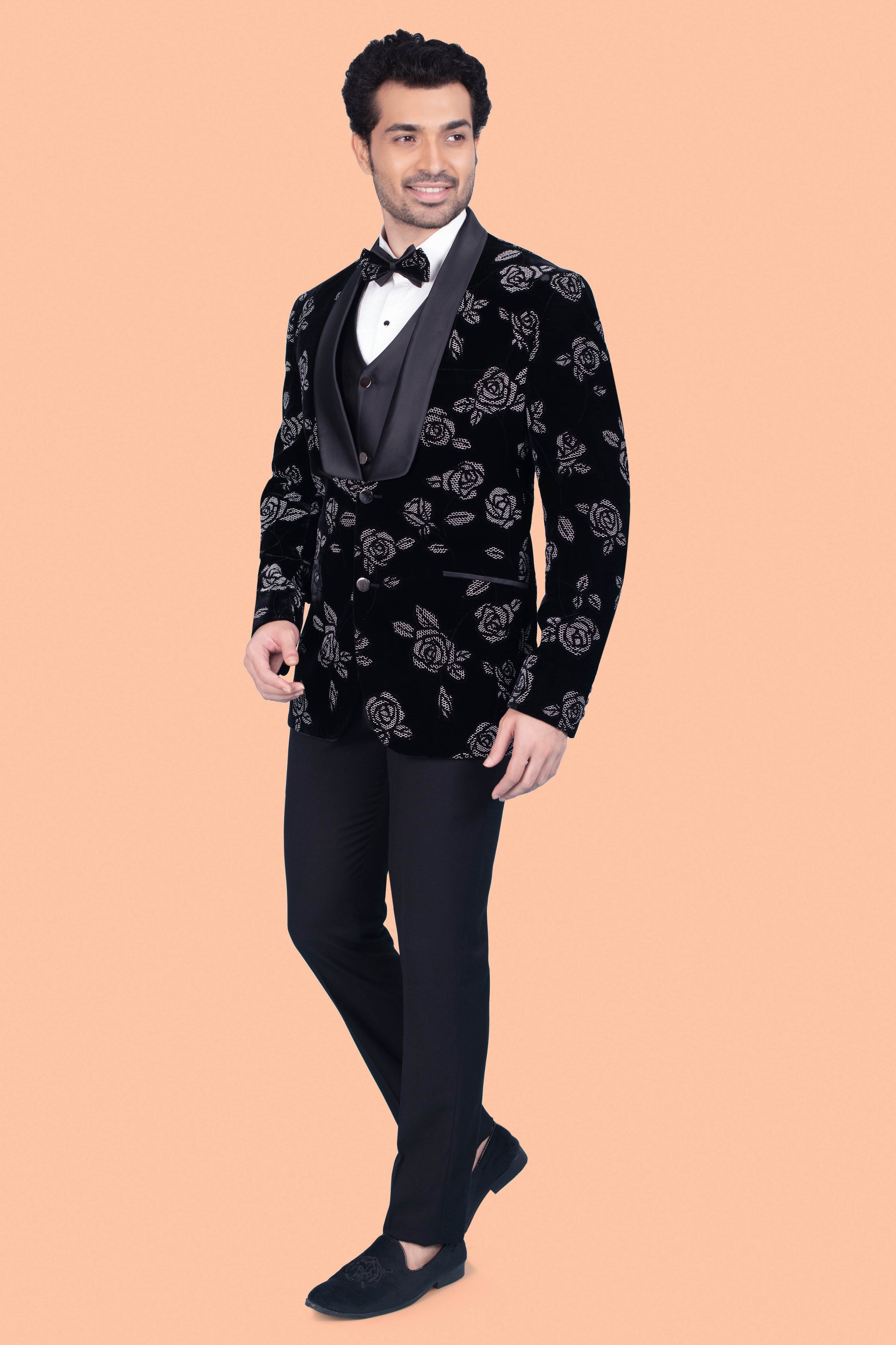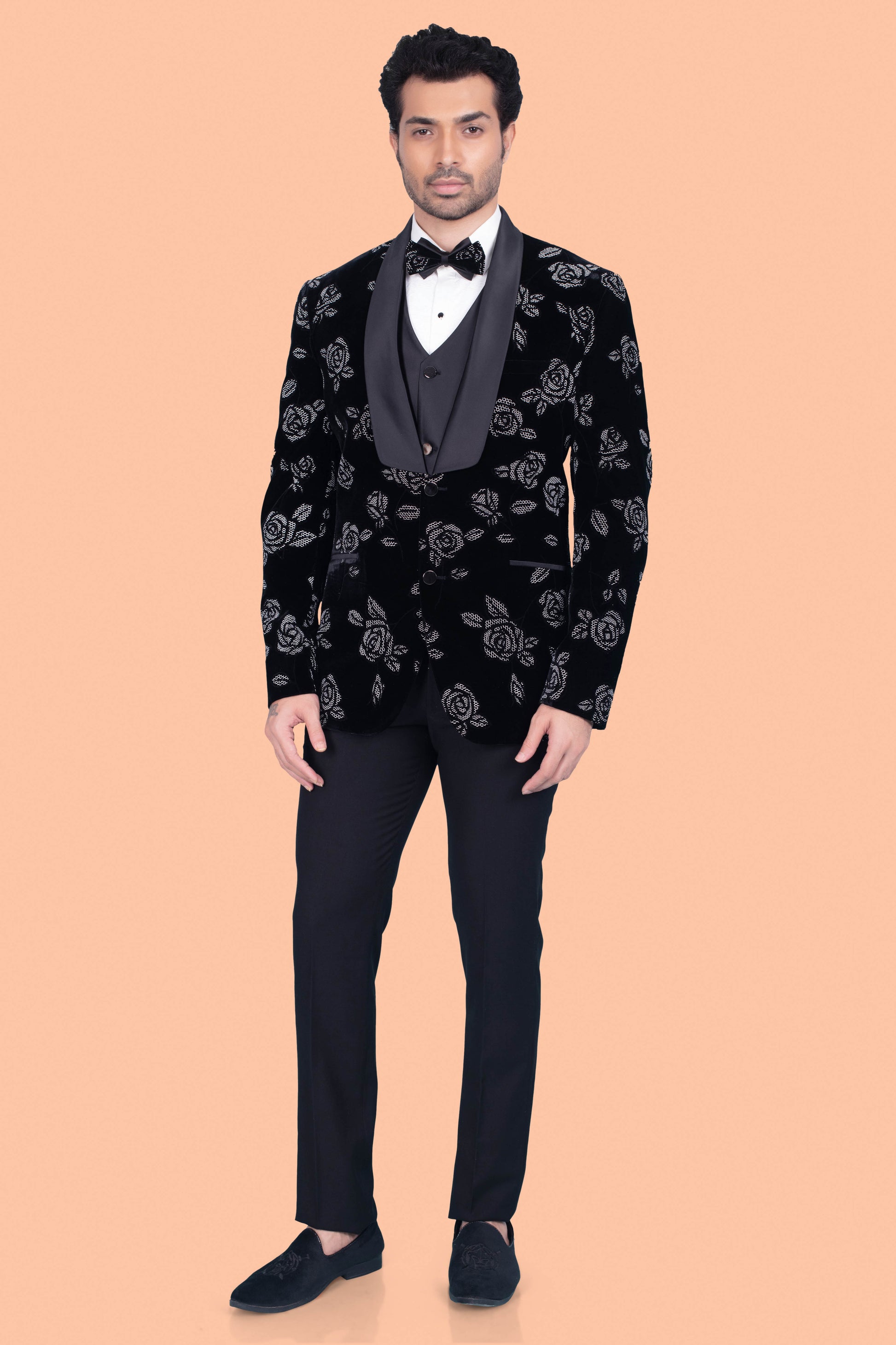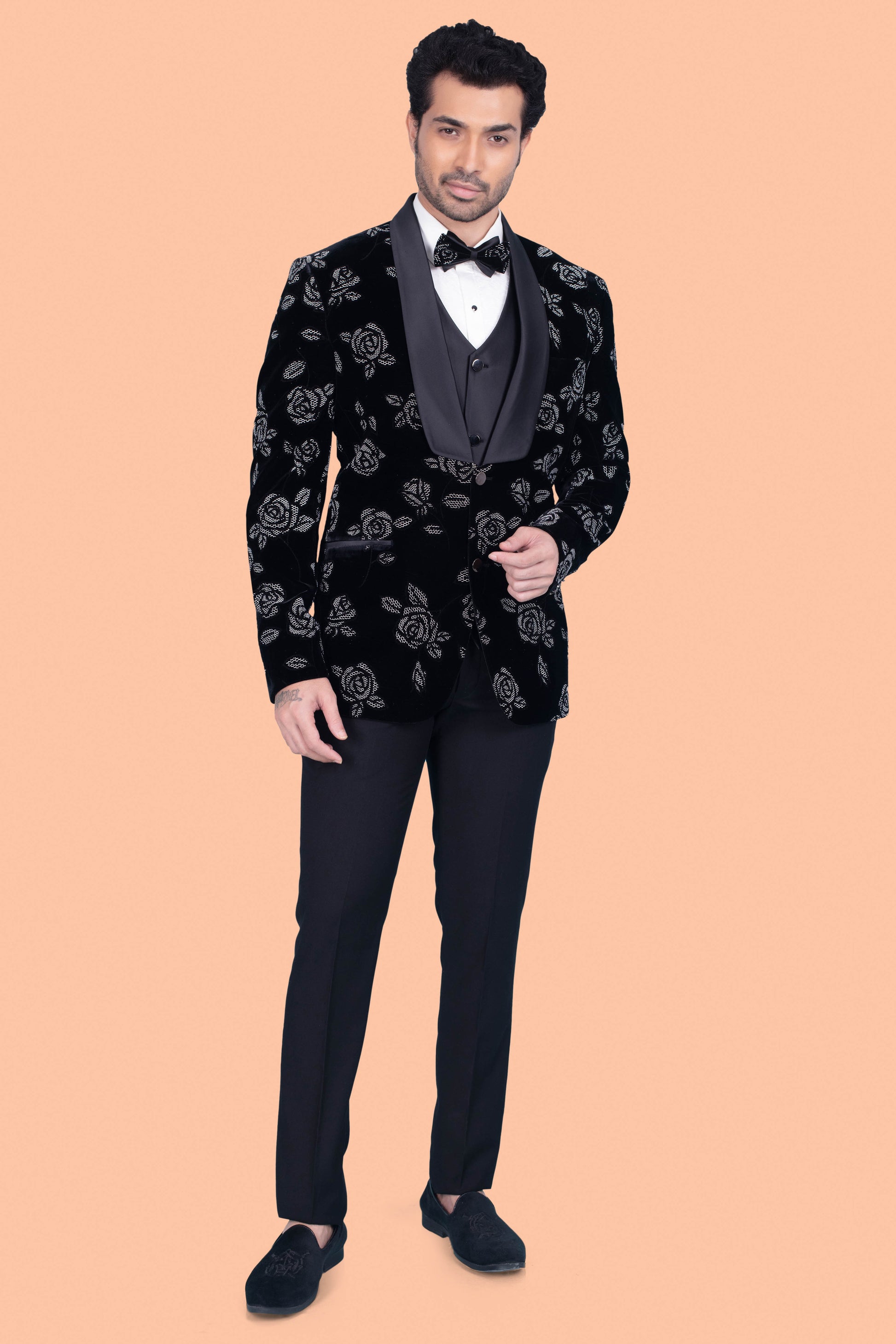 Expertly crafted with luxurious velvet and adorned with delicate white floral hand work, TUXEDO- R44-S4 exudes elegance and sophistication. The stunning design and intricate details make it a standout piece, perfect for special occasions. Elevate your style with this exquisite tuxedo.