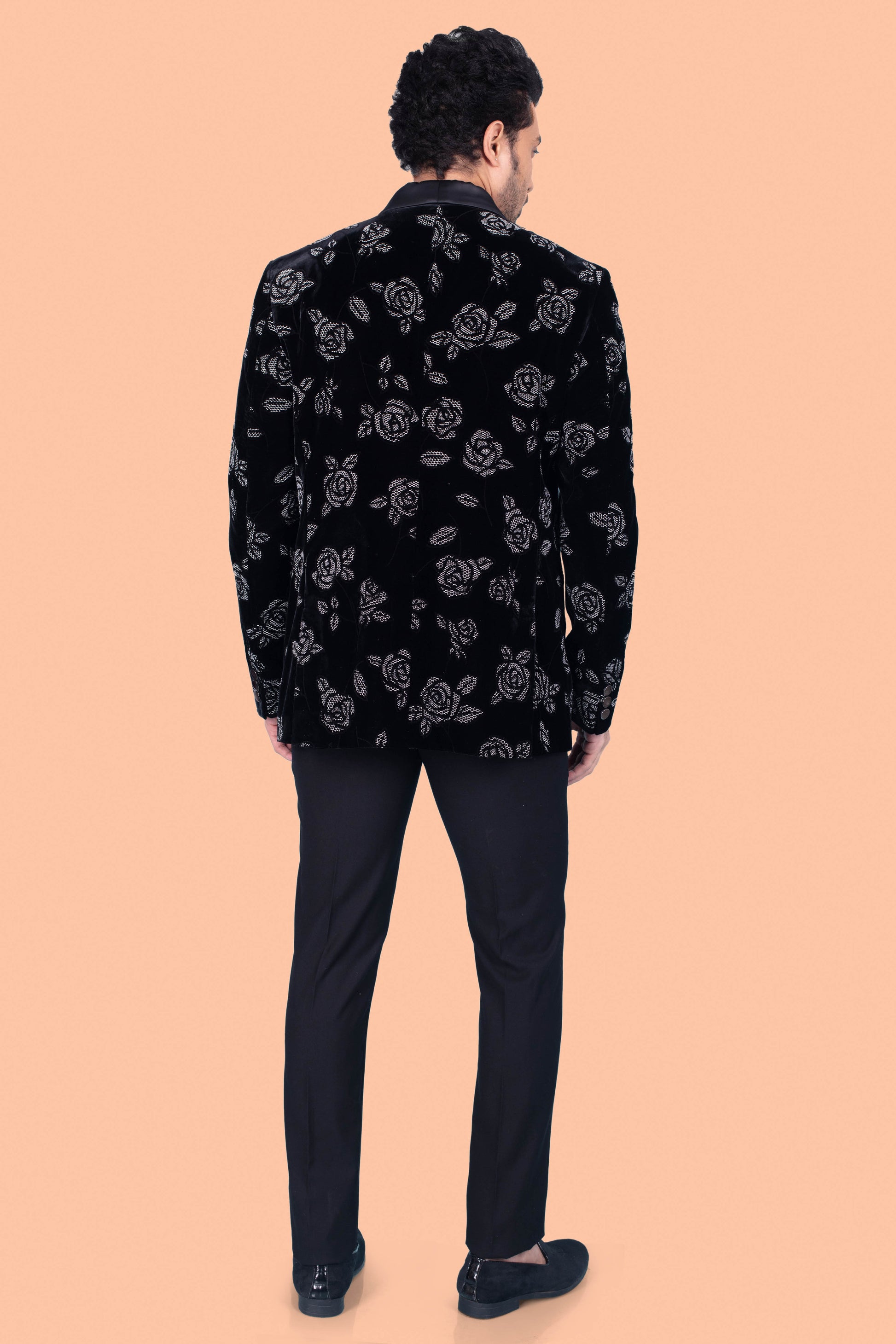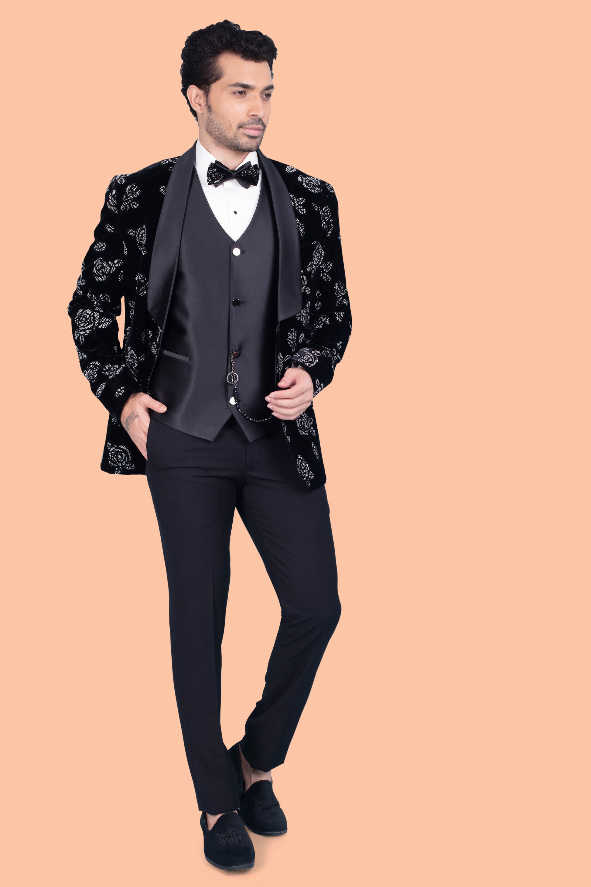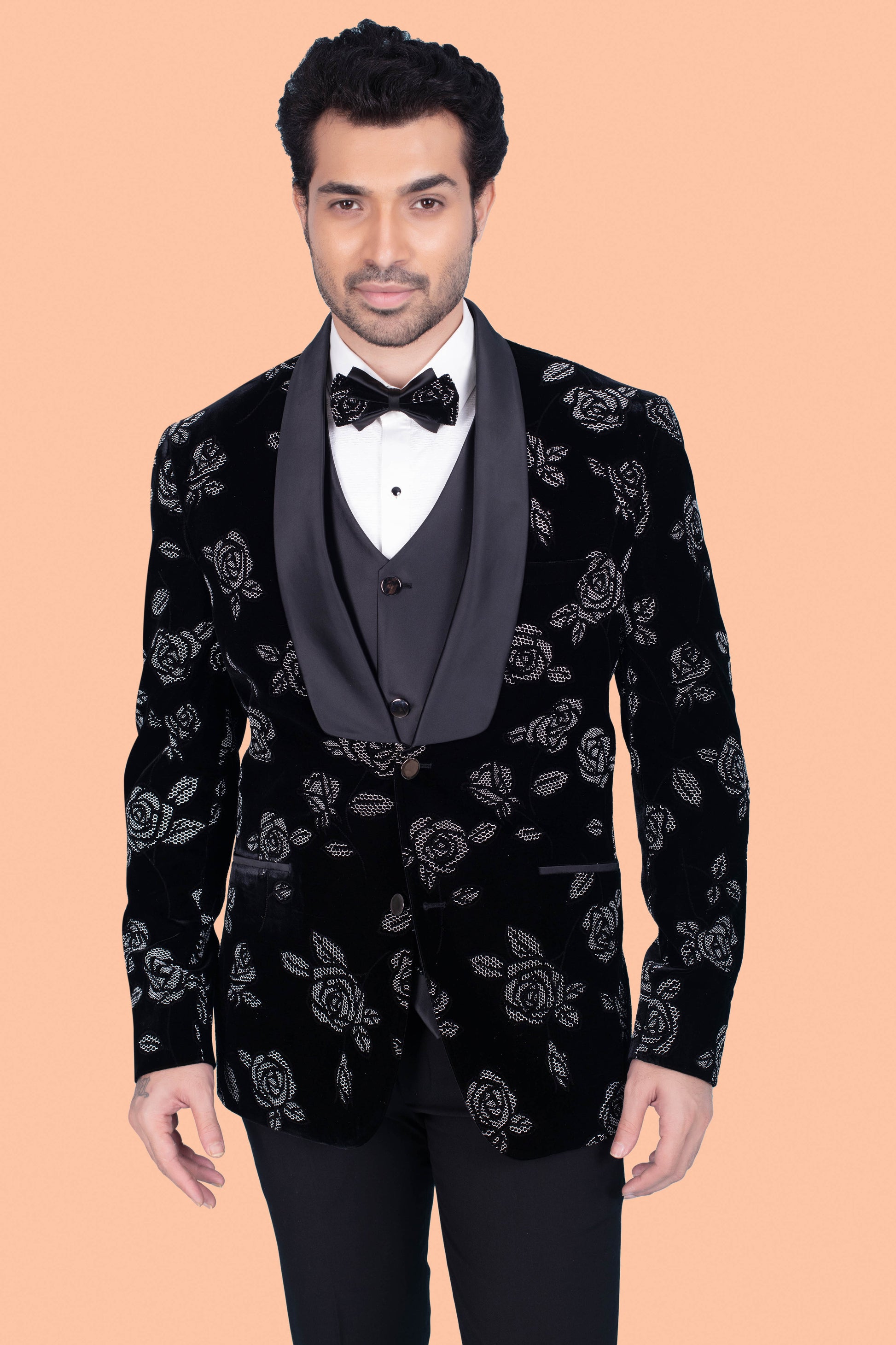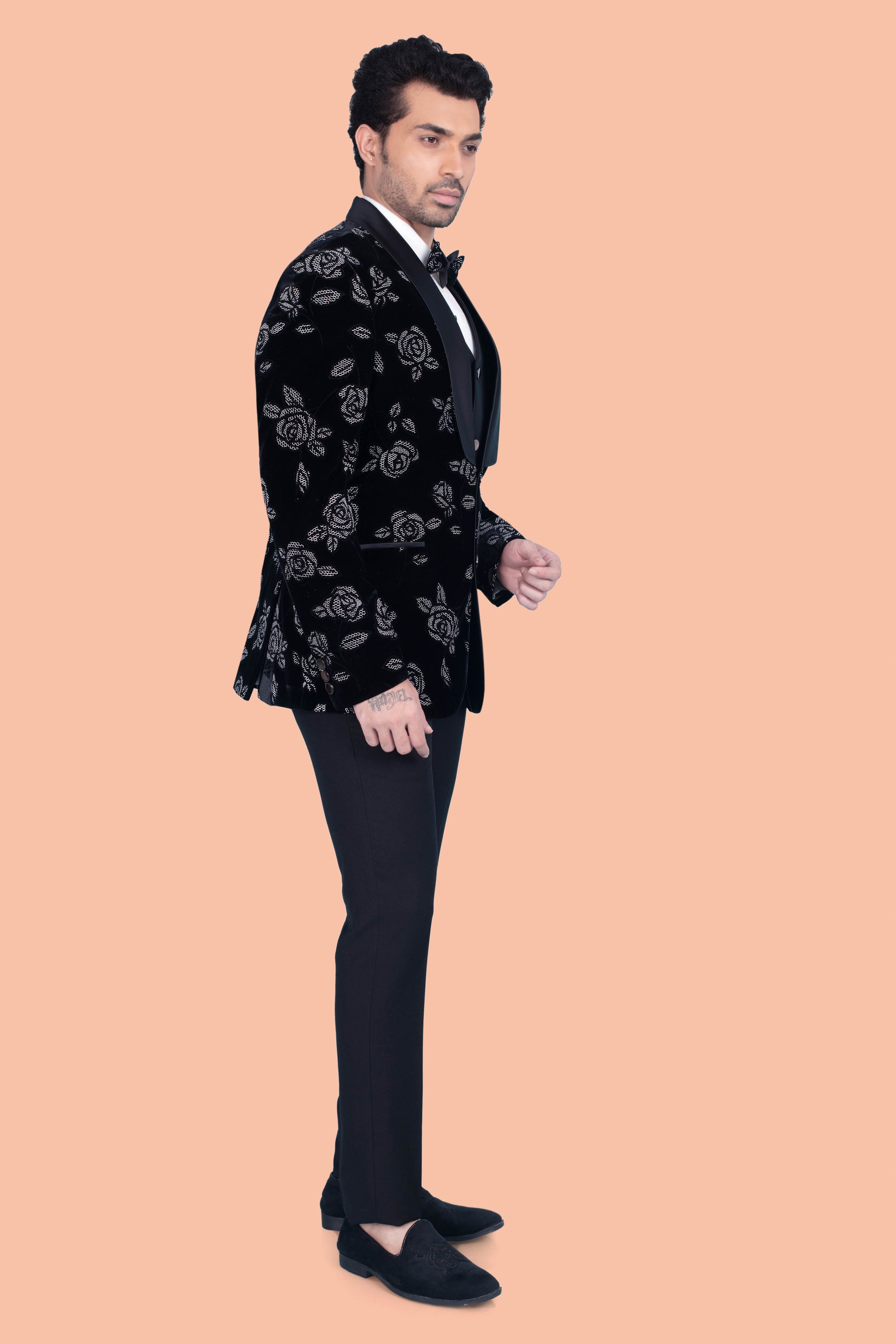 Expertly crafted with luxurious velvet and adorned with delicate white floral hand work, TUXEDO- R44-S4 exudes elegance and sophistication. The stunning design and intricate details make it a standout piece, perfect for special occasions. Elevate your style with this exquisite tuxedo.