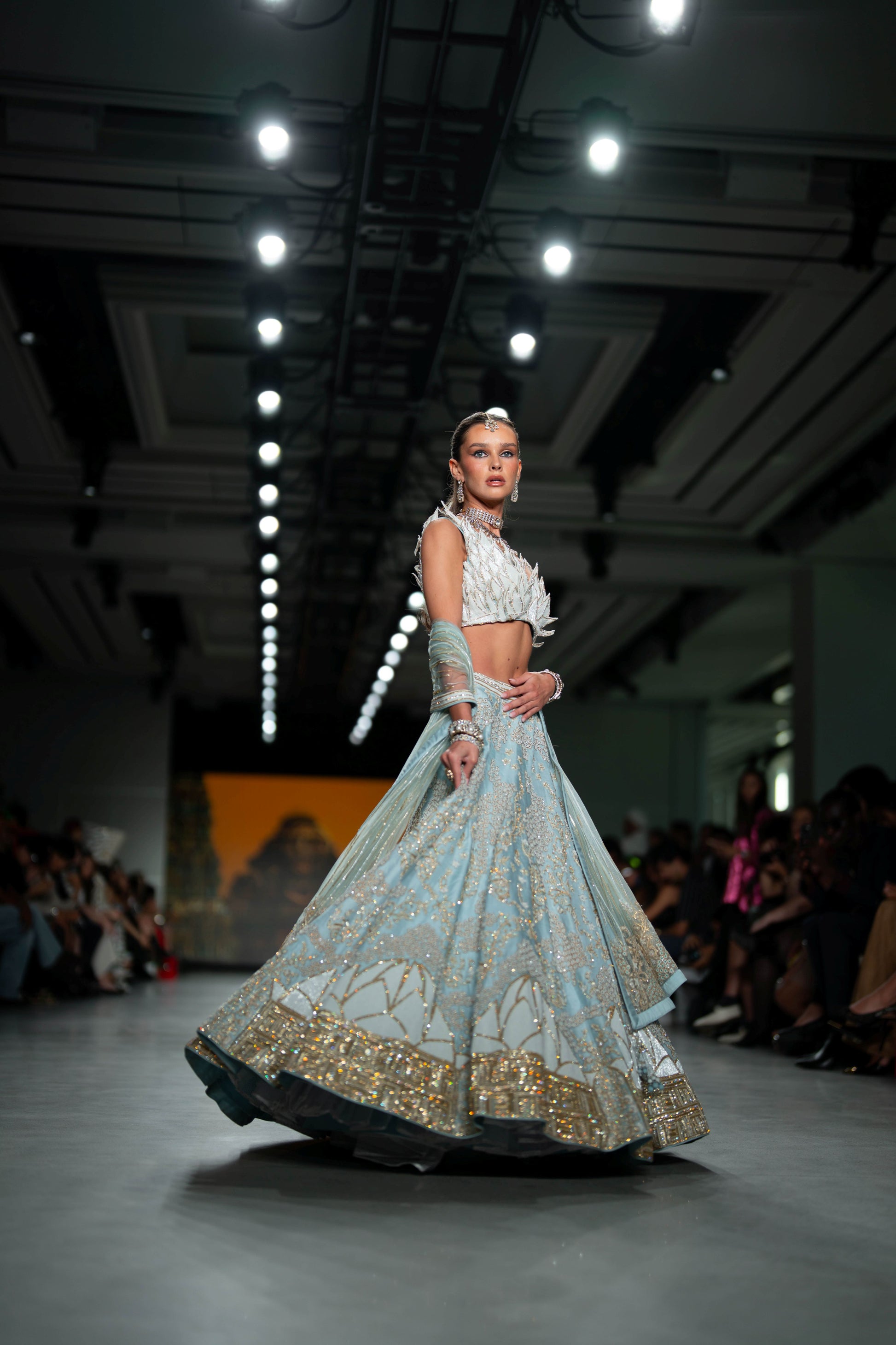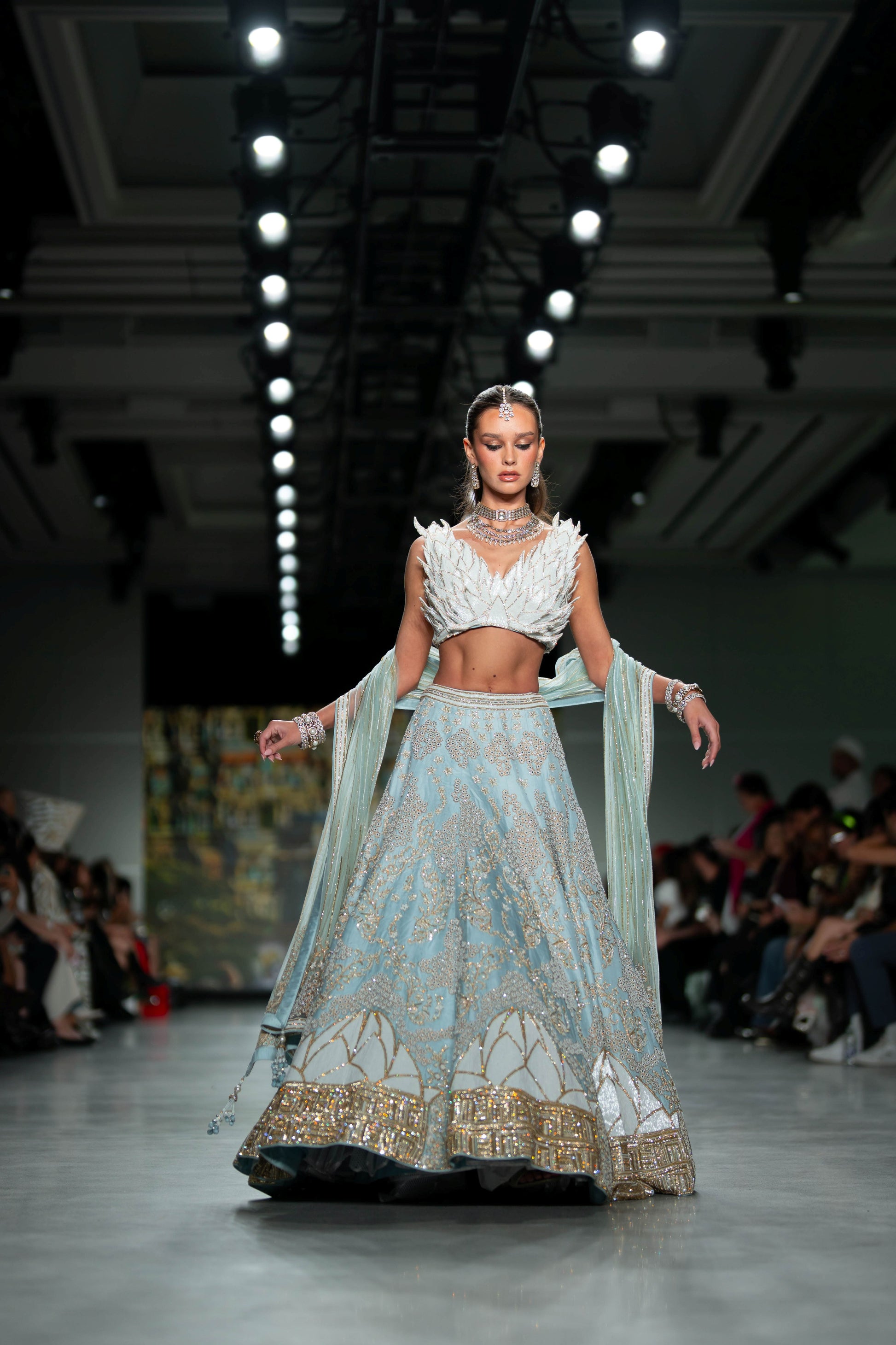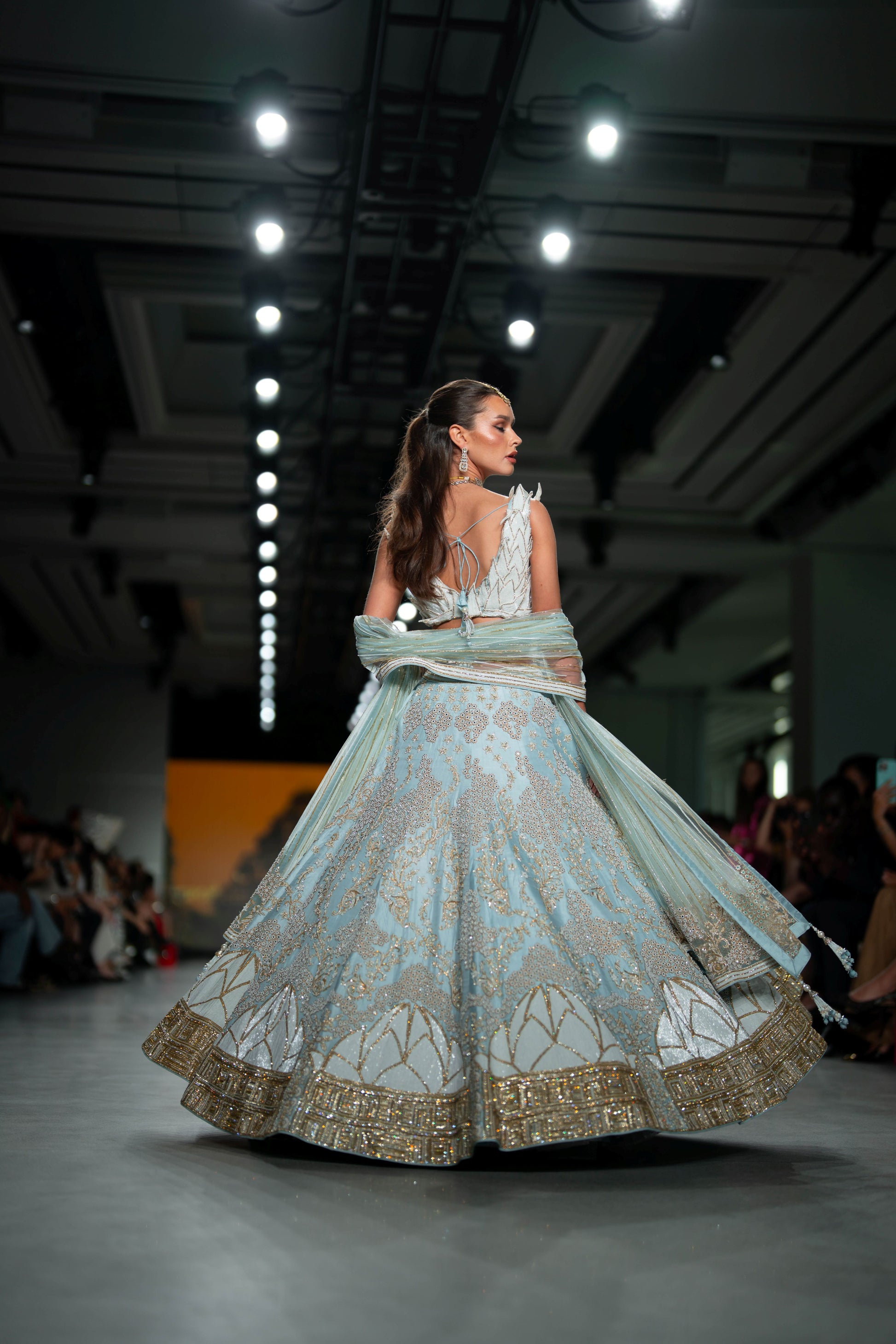 We chose the Lotus Temple because of its striking architecture. Our lehenga mirrors its lotus-inspired framework, with panels and pleats designed to reflect the temple’s petals.