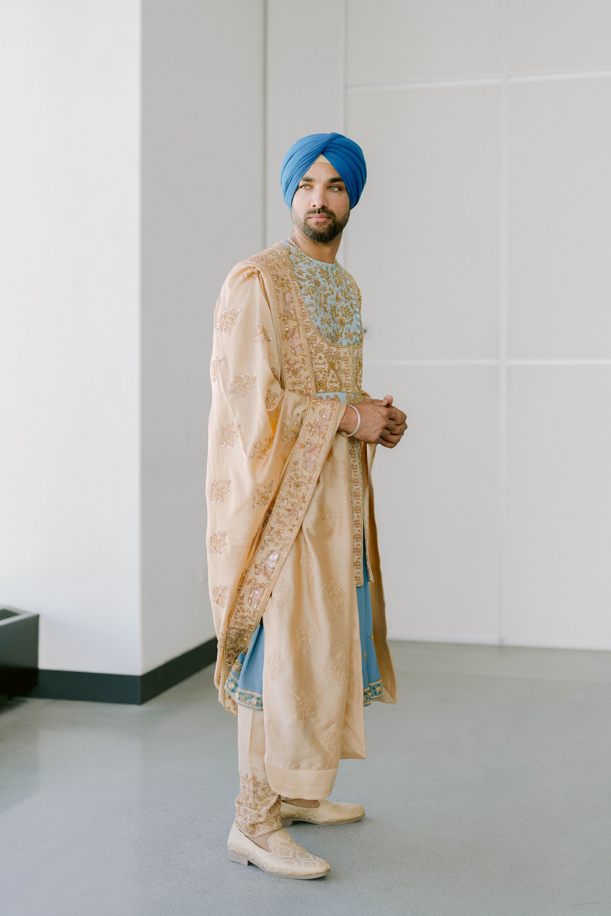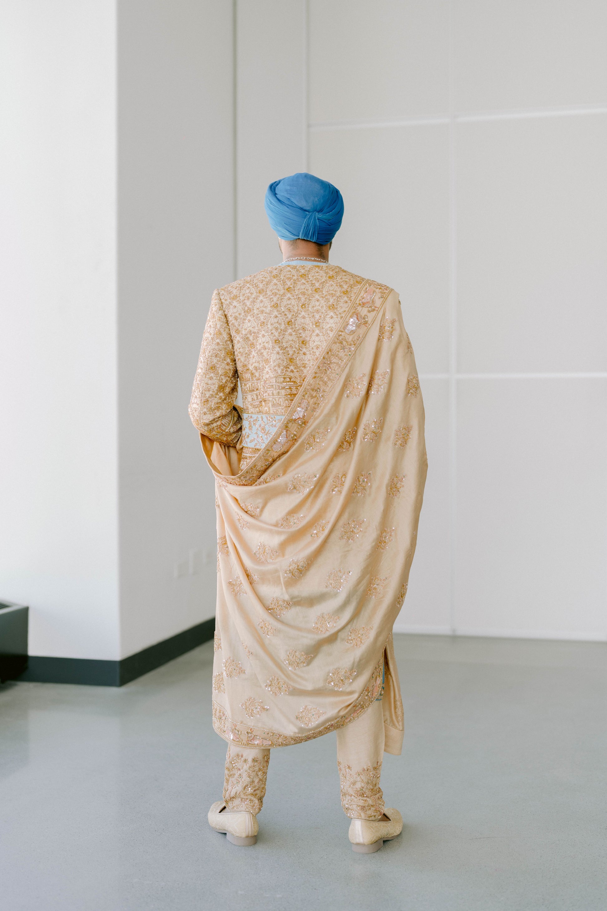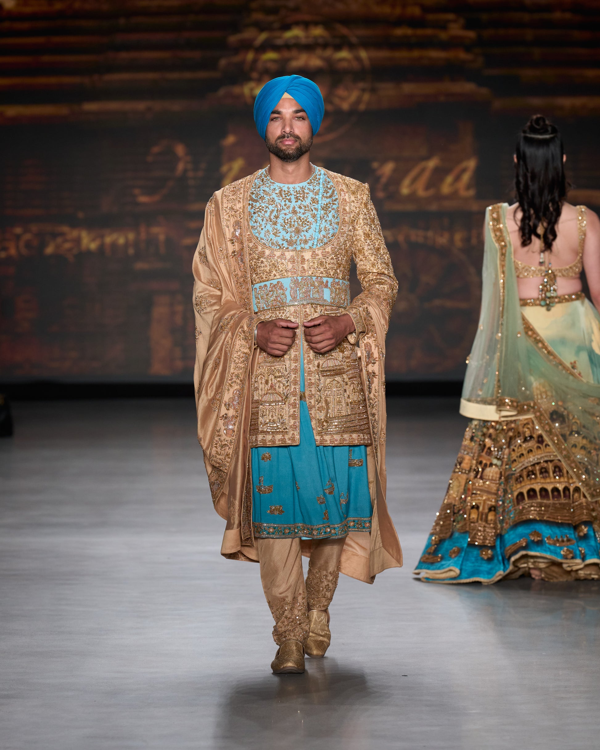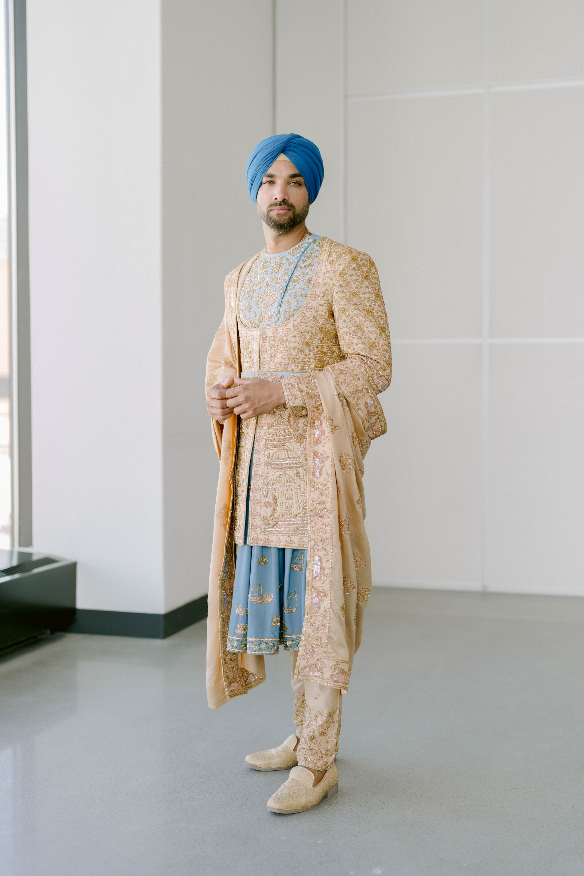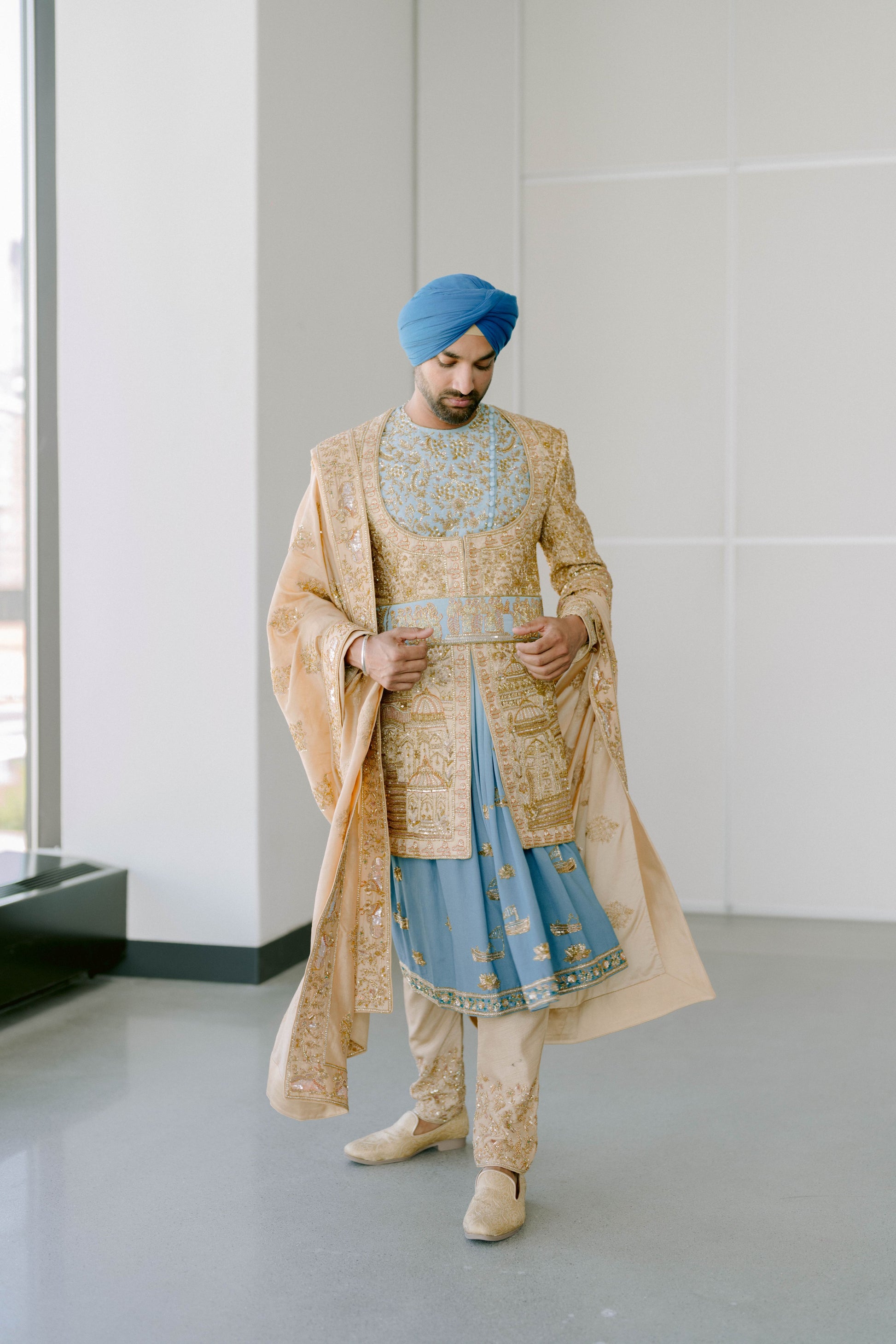 Known as one of the holiest and most powerful cities in the world, Varanasi carries an energy unlike any other. This sherwani captures that spirit through an Anarkali kurta in blue symbolizing Maa Ganga, with embroidered panels on both sides depicting the sacred ghats. The belt portrays the iconic Ganga Aarti performed along the river, seamlessly blending these elements to give a visual representation of Varanasi.