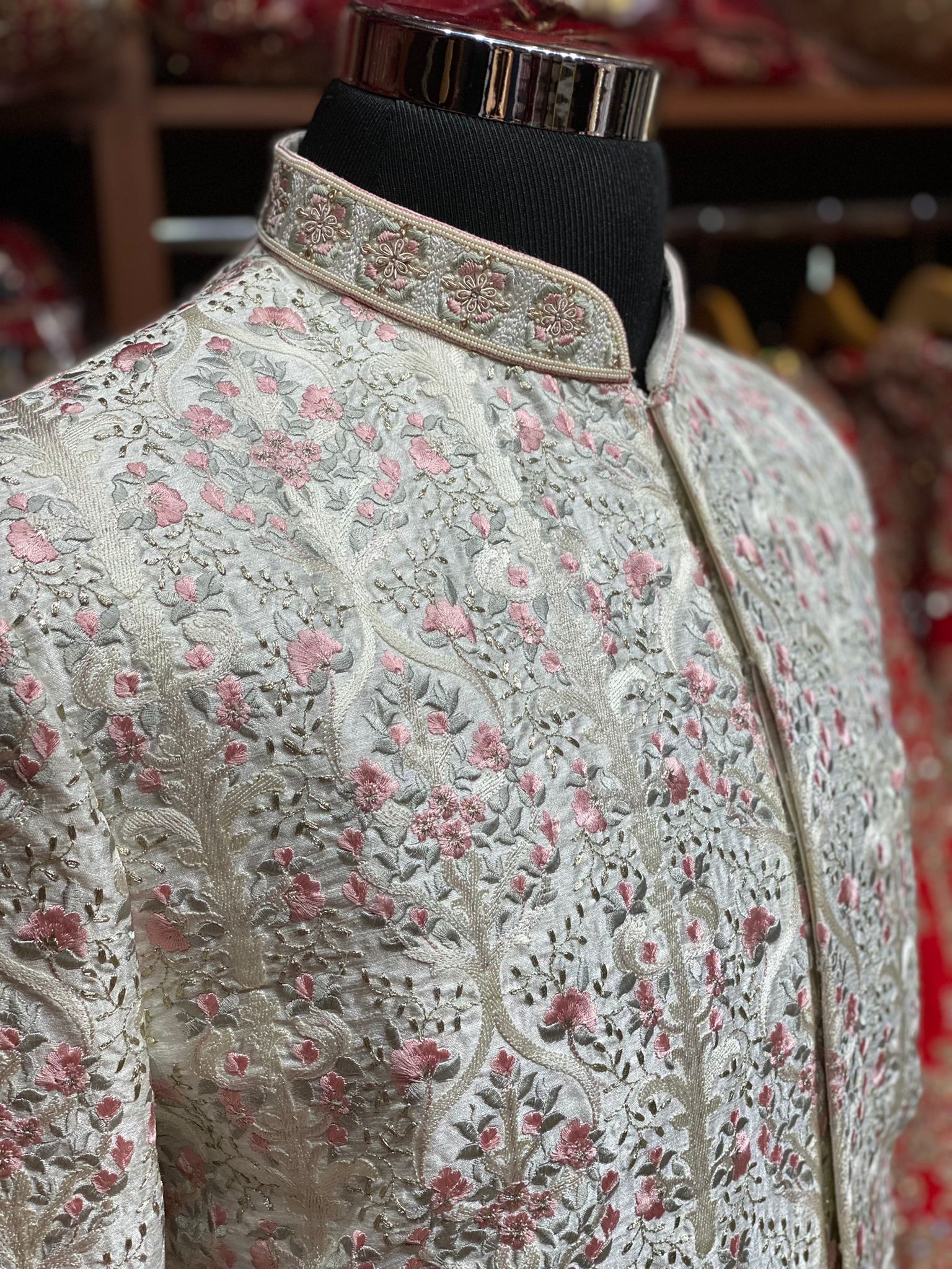 Off white sherwani is adorably adorned with pure resham threads with pink and grey combinations with zari enchanting floral motifs all over including mandarin collar with pearl, cut dana and thread. This magnificent sherwani is perfectly paired churidar pant to conclude your over all look of an ensemble.