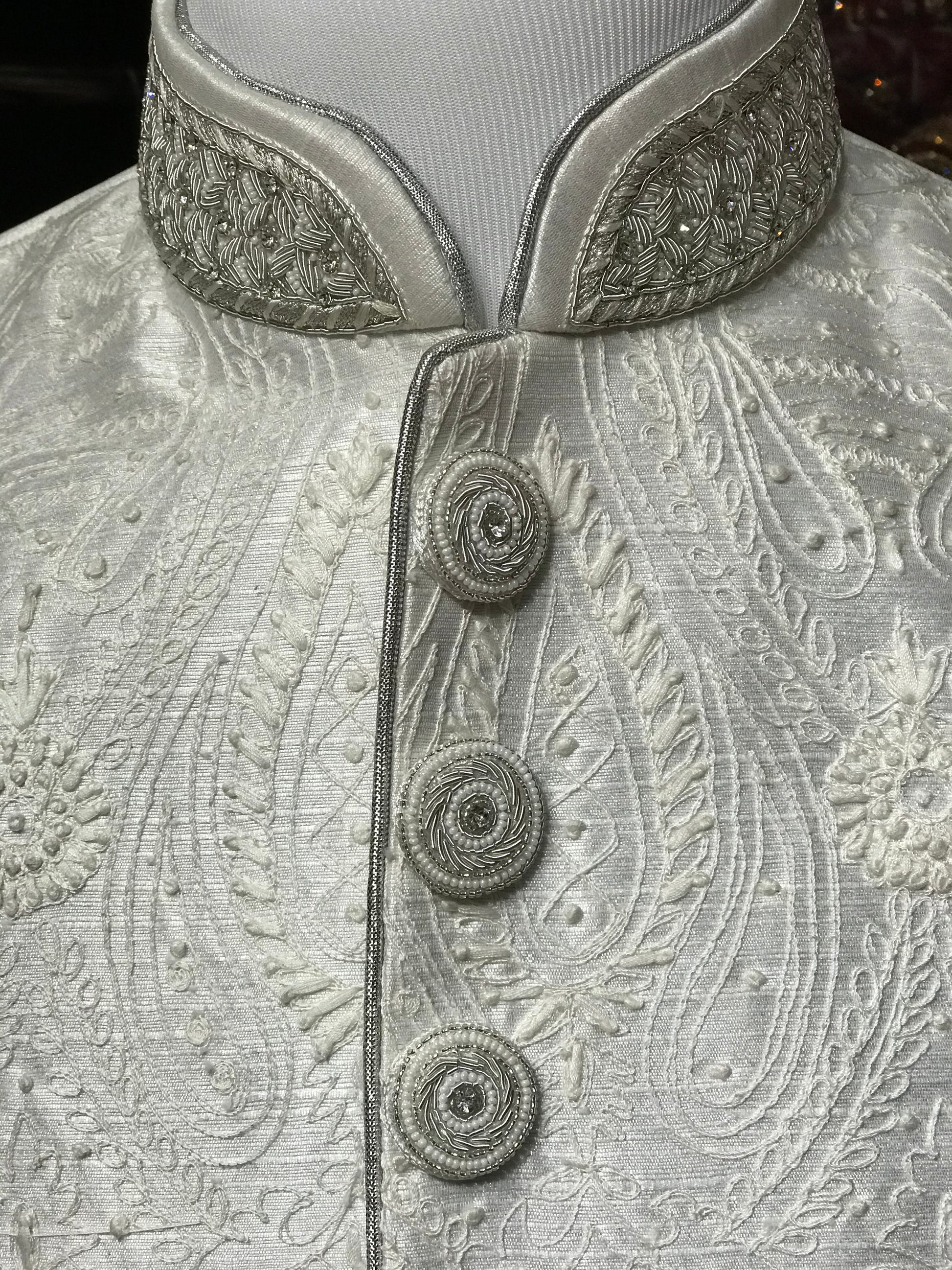 Pure white raw silk sherwani with self resham embroidery. Silver zardosi and crystal work on the collar and wrist. Paired with a white chudidar