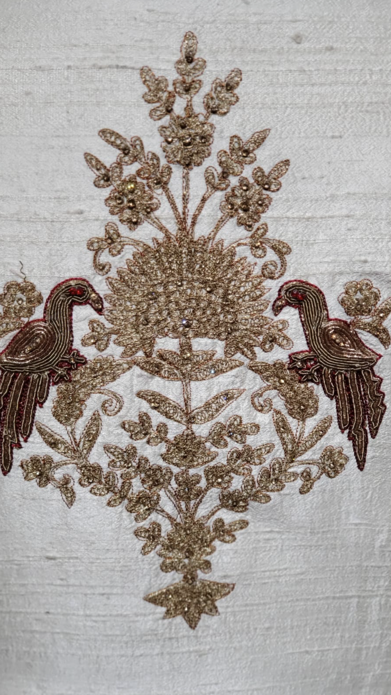 Pure white raw silk sherwani with exquisite embroidery depicting various figurines! Accented with red stones and a silk dupatta and silk safa!