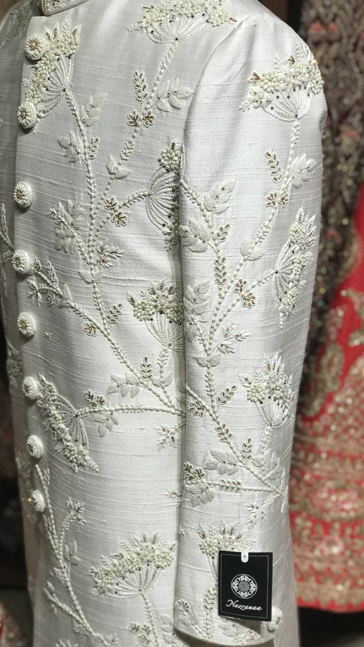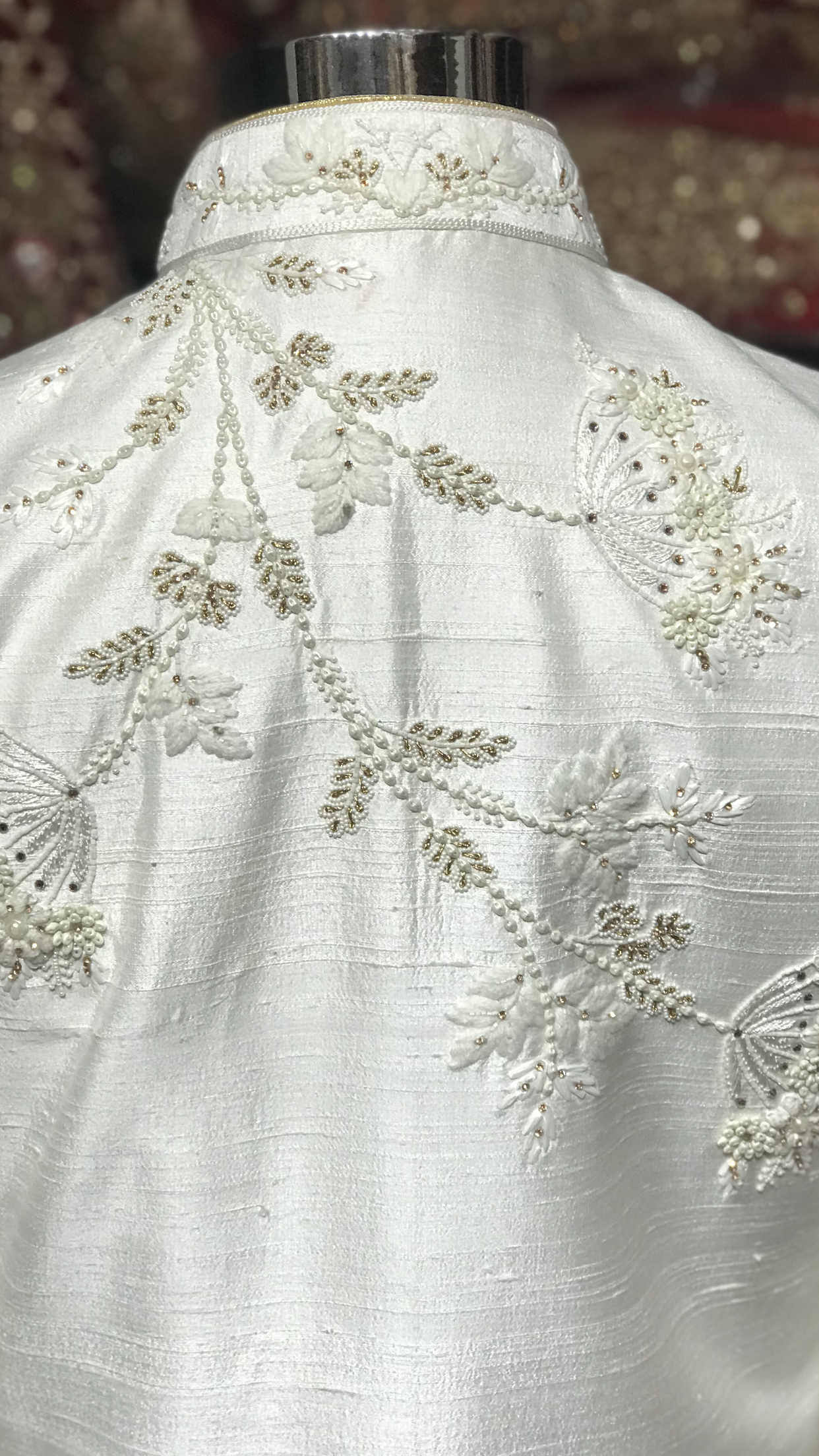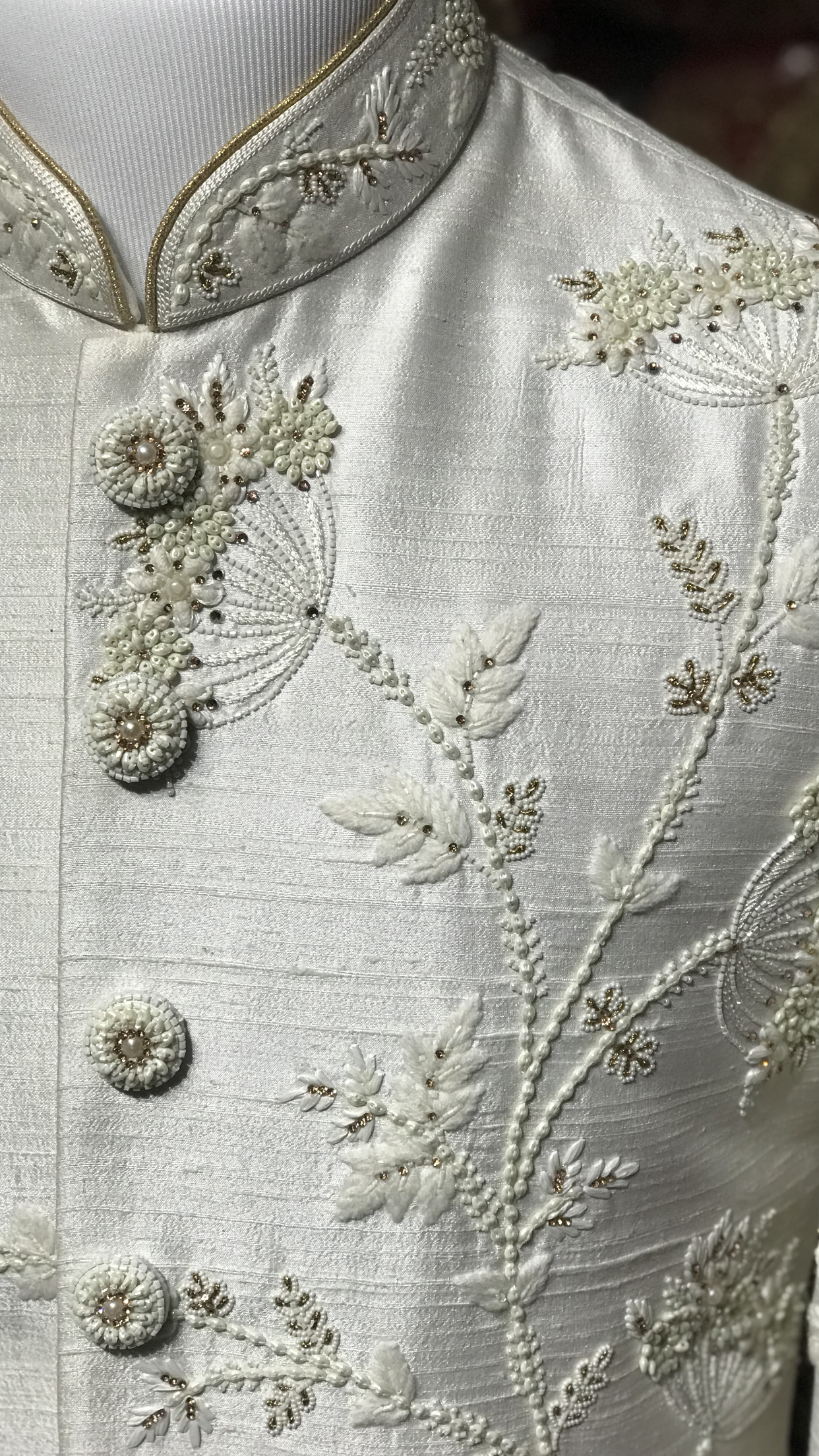 White raw silk sherwani with resham, pearls, cutdana and rose gold stone embroidery. Paired with a white chudidar