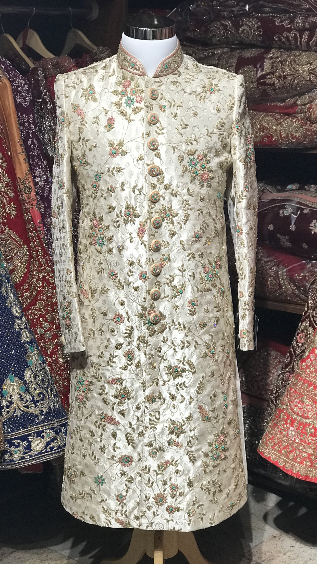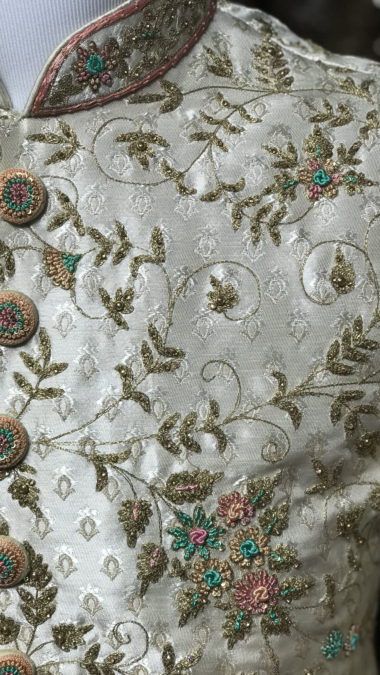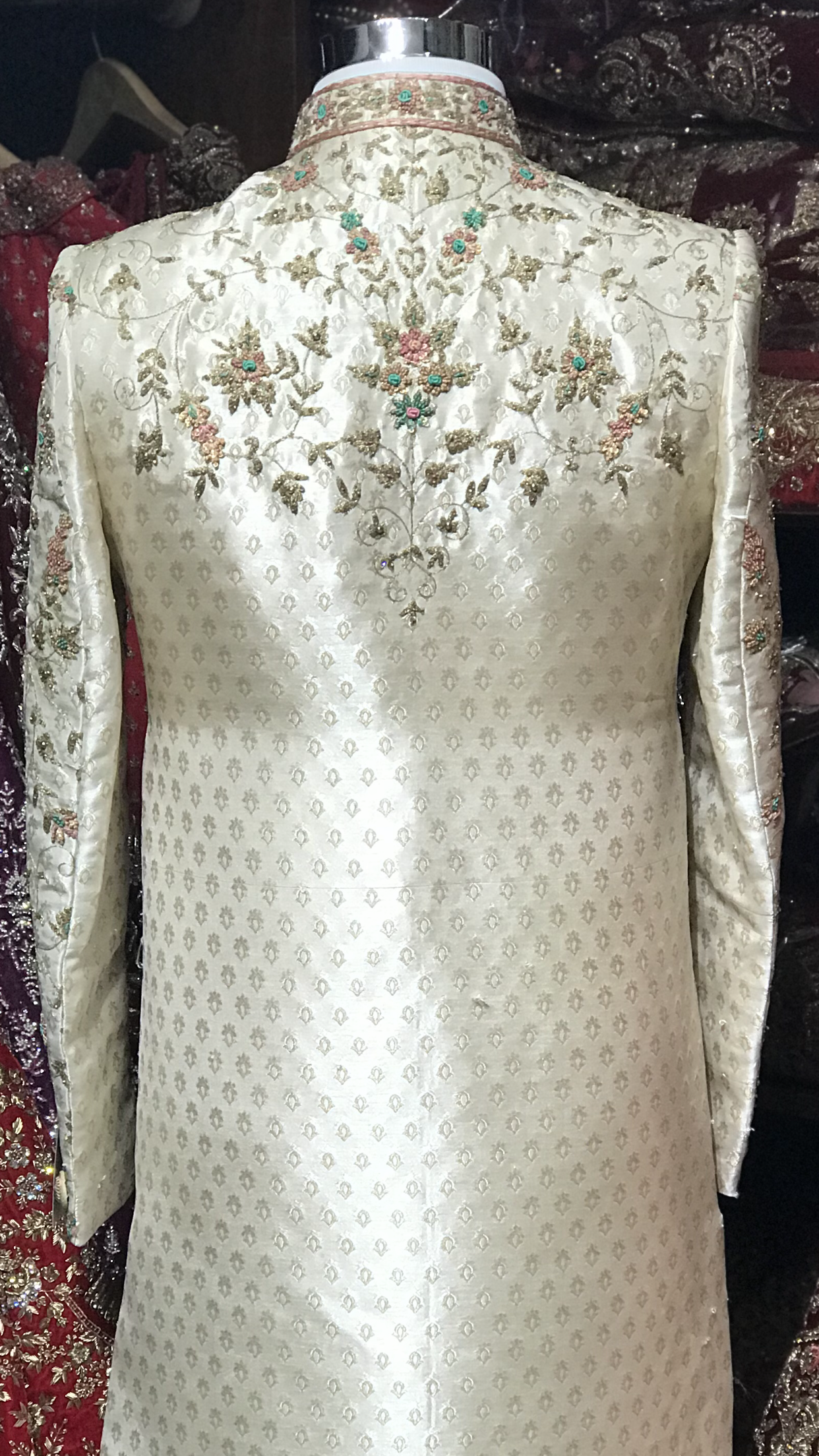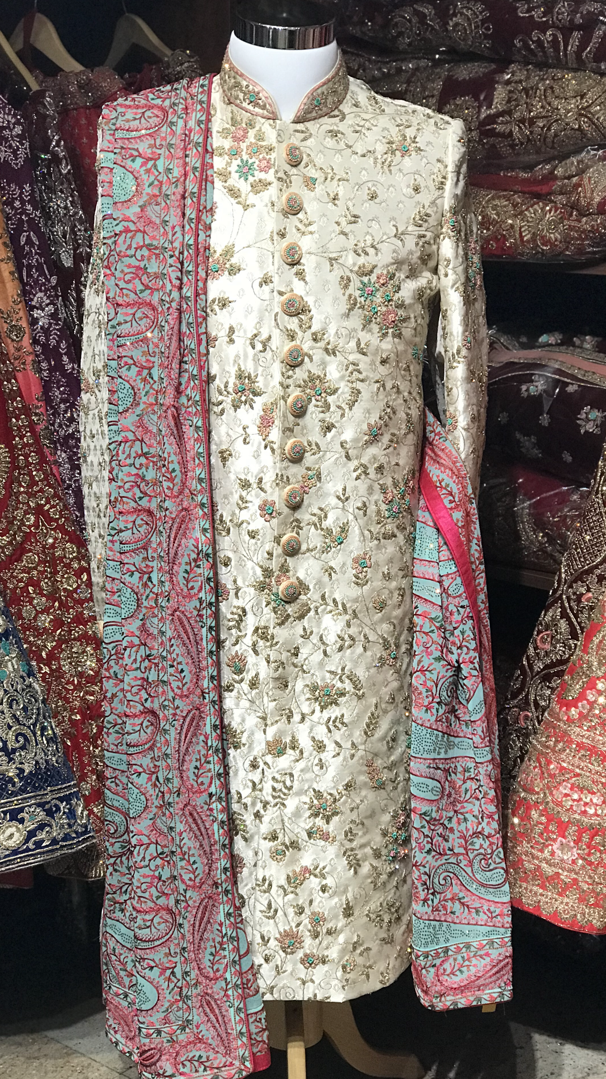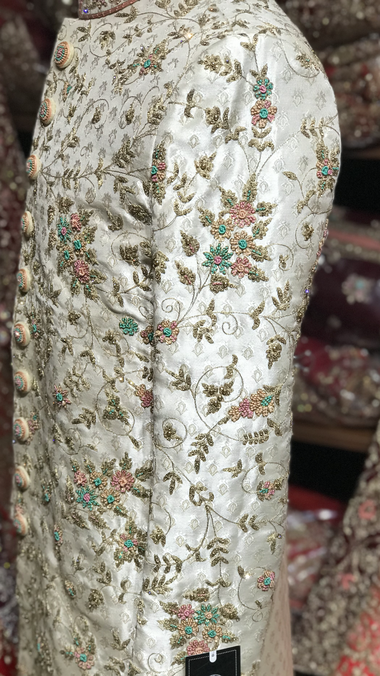 Ivory sherwani with multicolor resham embroidery & stone work! The accent colors include peach, pink and green. Paired with an ivory chudidar. The sherwani doesn’t come with the dupatta showed in the picture.